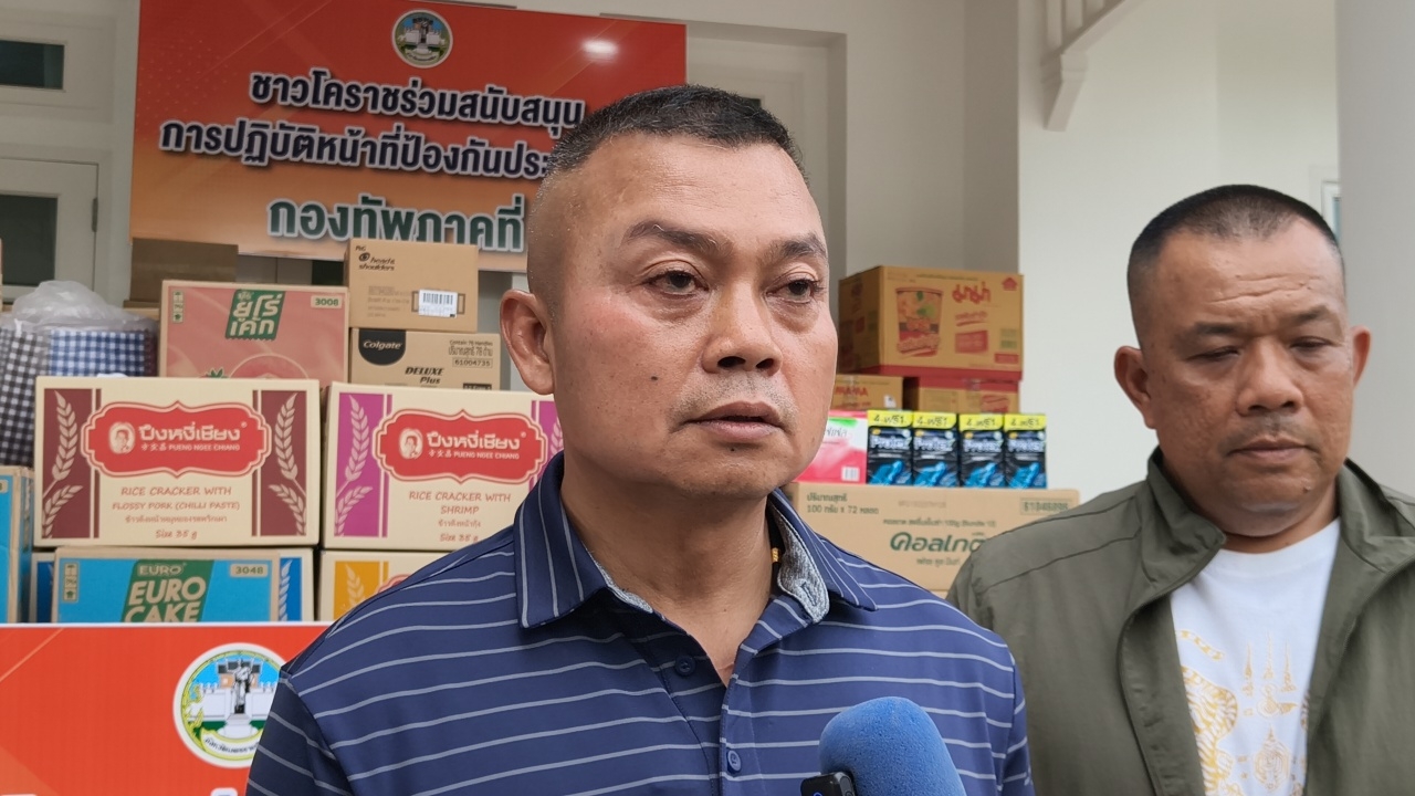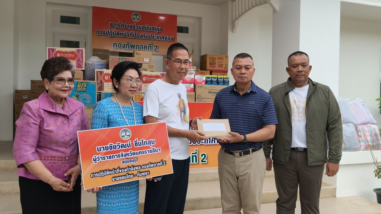 เมื่อเวลา 17.30 น. วันที่ 14 กรกฎาคม 2568 ที่จวนผู้ว่าราชการจังหวัดนครราชสีมา พลโท บุญสิน พาดกลาง แม่ทัพภาคที่ 2 เดินทางมารับมอบธารน้ำใจจากชาวไทยสู่ธารน้ำใจพี่น้องชาวไทยสู่ทหารชายแดน โดยนายชัยวัฒน์ ชื่นโกสุม ผู้ว่าราชการจังหวัดนครราชสีมา อ๊อฟ พงษ์พัฒน์ วชิรบรรจง และ แดง เนตรพนิต โพธารากุล พร้อมด้วยบริษัทห้างร้านในจังหวัดนครราชสีมา และสำนักงานสลากกินแบ่งรัฐบาล ได้นำเครื่องอุปโภคบริโภค พร้อมด้วยเงินสด จำนวน 1,550,509 บาท เพื่อเป็นขวัญและกำลังใจมอบสนับสนุนให้กำลังพลทหารที่ปกป้องประเทศชาติในเขตชายแดนไทย-กัมพูชา พร้อมทั้งนำไปซื้อโดรนบินตรวจปกป้องประเทศชาติ
