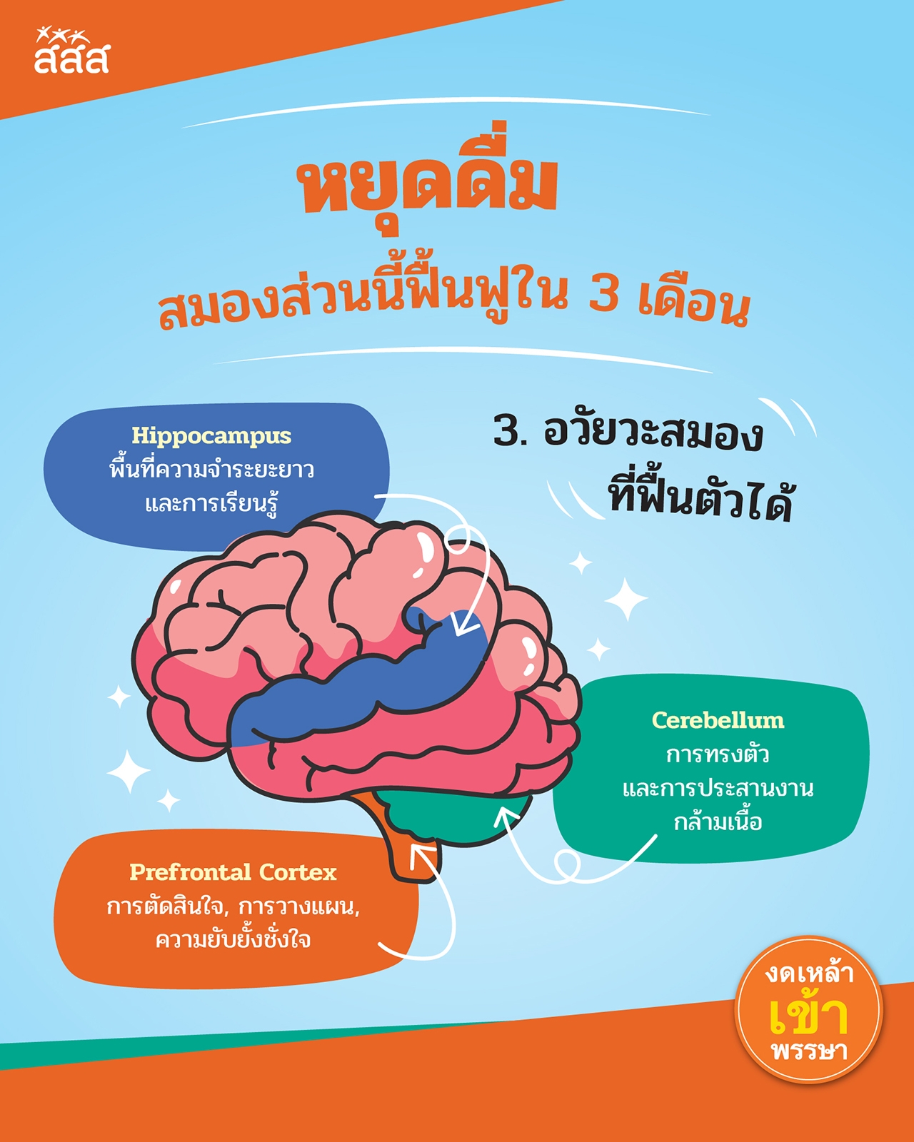 1. โครงสร้างสมองดีขึ้น งานวิจัยจาก Journal of Neuroscience ปี 2015 พบว่า โครงสร้างสมองเพิ่มขึ้นได้ภายใน 2-6 เดือน หลังหยุดดื่ม ขณะที่บริเวณฮิปโปแคมปัสซึ่งเกี่ยวข้องกับความจำ ก็ฟื้นตัวได้อย่างชัดเจนหลังงดดื่มแอลกอฮอล์ 6 สัปดาห์ขึ้นไป