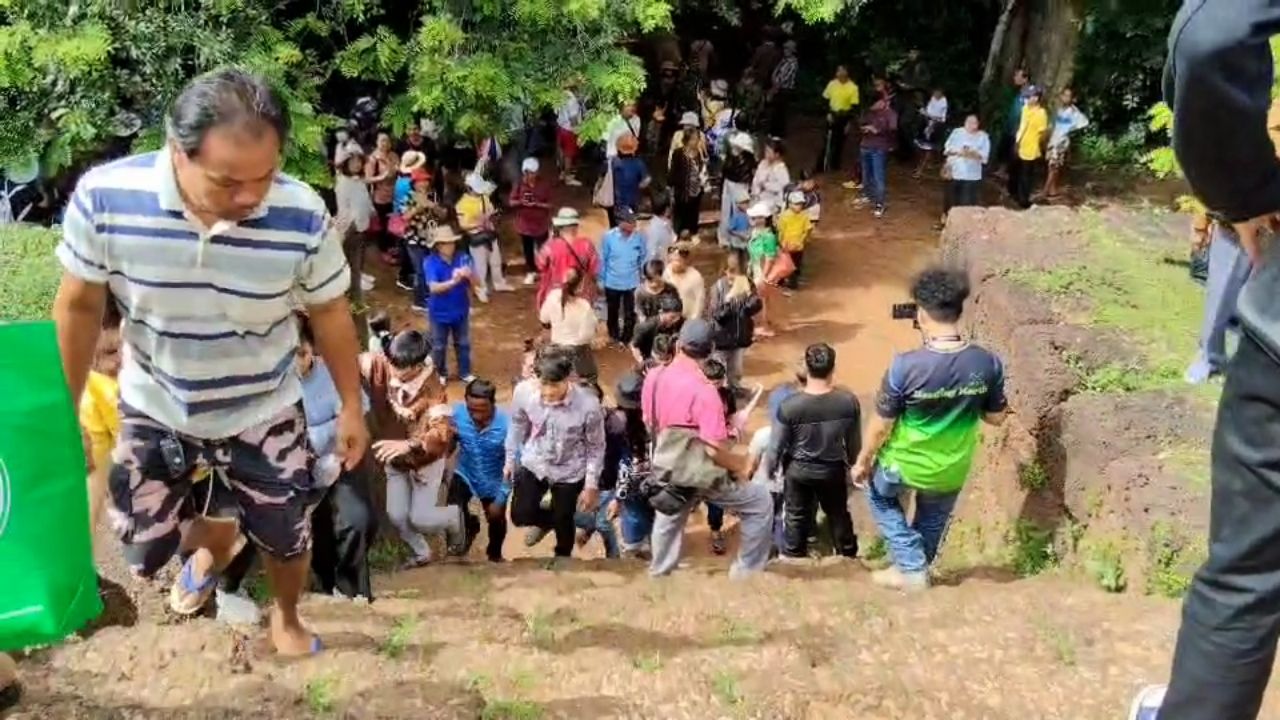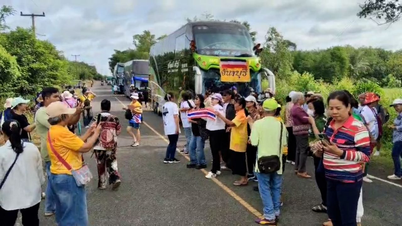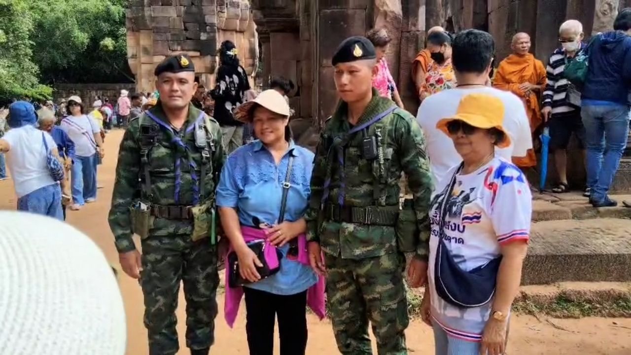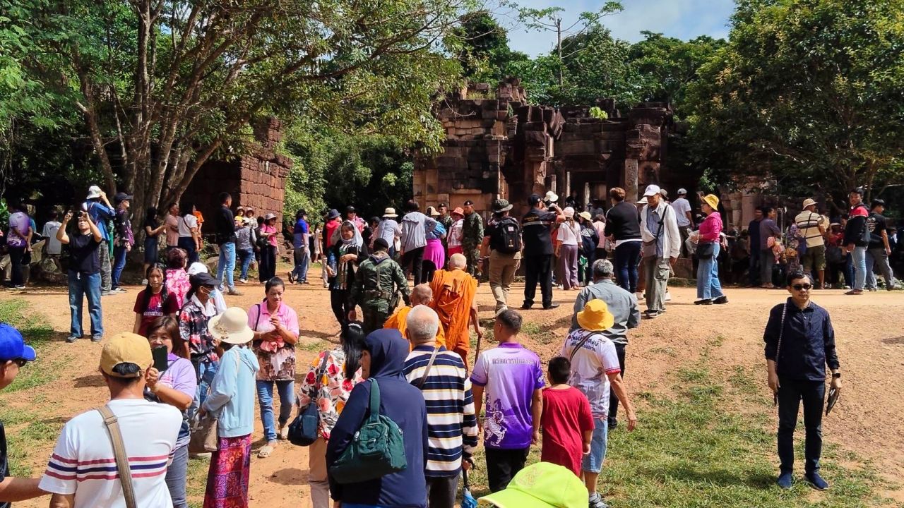 เมื่อวันที่ 20 กรกฎาคม 2568 ผู้สื่อข่าวรายงานถึงบรรยากาศที่ปราสาทตาเมือนธม ต.ตาเมียง อ.พนมดงรัก จ.สุรินทร์ ตั้งแต่เช้า ก่อนเวลาเปิด 9 โมง พบคณะคนไทยรักชาติ จ.จันทบุรี ที่เดินทางโดยรถทัวร์ 4 คัน รถตู้อีก 5 คัน มาแสดงพลังมอบสิ่งของให้กำลังใจทหารไทย โดยจอดรถรอเวลาที่ถนนทางเข้าหน้าฐานทหารด่านแรก ก่อนพากันลงมารอเวลาเปิดเพลงร้อง เต้นรำ ชูป้ายกันอย่างสนุกสนาน ขณะที่คนไทยจากหลายจังหวัดเริ่มขับรถยนต์ส่วนตัวทยอยเดินทางเข้ามาอย่างต่อเนื่อง