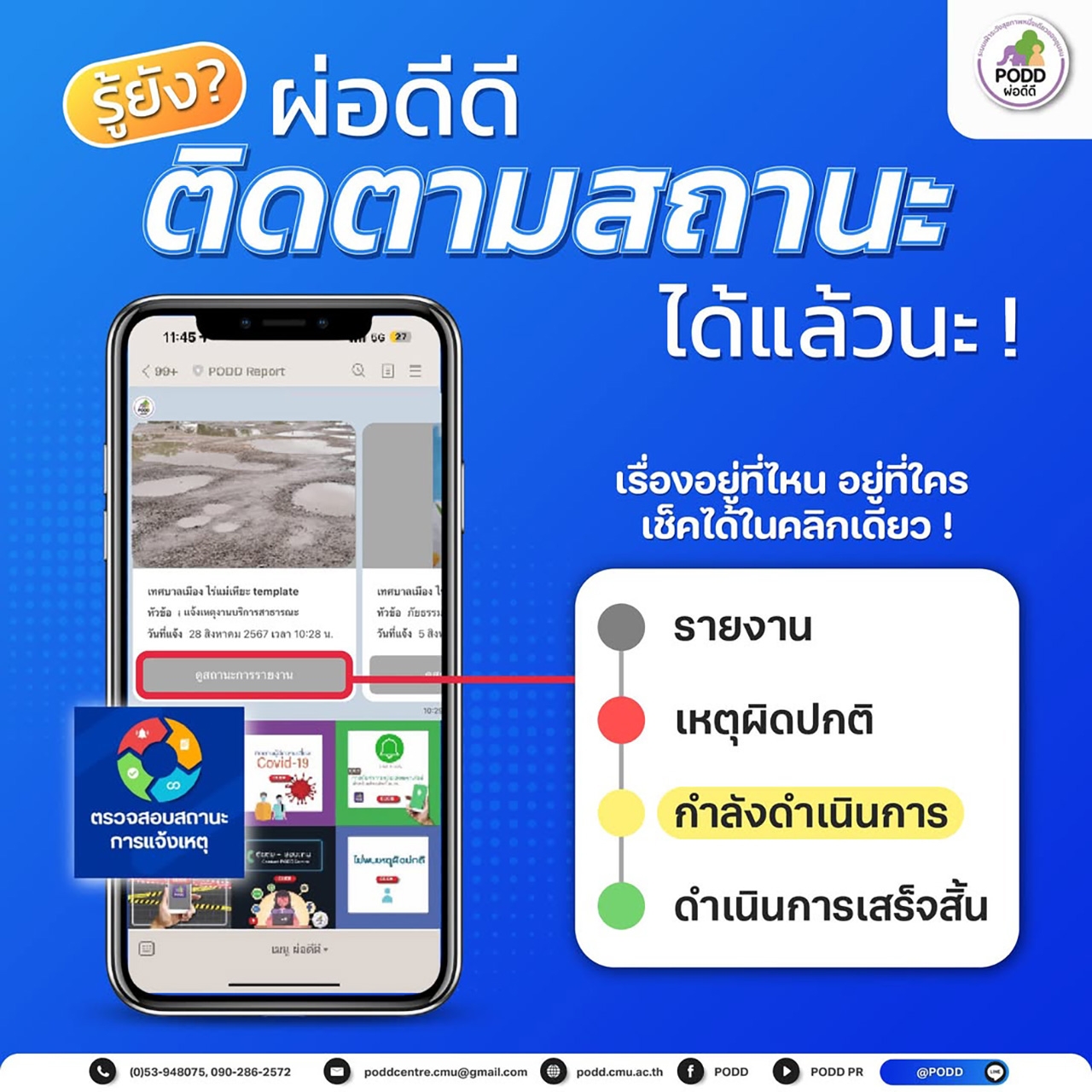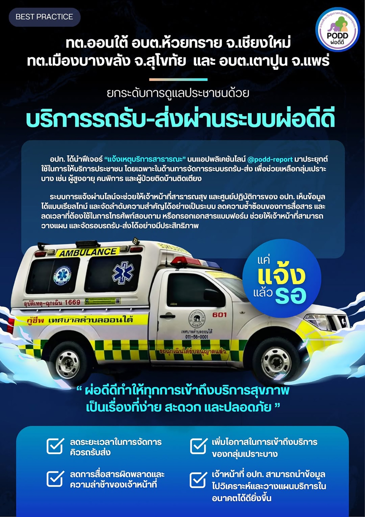 มหาวิทยาลัยเชียงใหม่ โดย ศูนย์เฝ้าระวังสุขภาพหนึ่งเดียว พัฒนาบริการรถรับ-ส่งผู้ป่วยผ่าน "ผ่อดีดี (PODD)" ระบบดิจิทัลเฝ้าระวังสุขภาพคน สัตว์ สิ่งแวดล้อม ภัยธรรมชาติ และสาธารณภัย เป็นเครื่องมือที่สามารถตรวจจับเหตุผิดปกติสุขภาพหนึ่งเดียวได้อย่างรวดเร็ว (Early Detection) โดยอาศัยสมาร์ทโฟนในการรายงาน ประมวลผล และแจ้งข่าวสารอัตโนมัติแบบเรียลไทม์