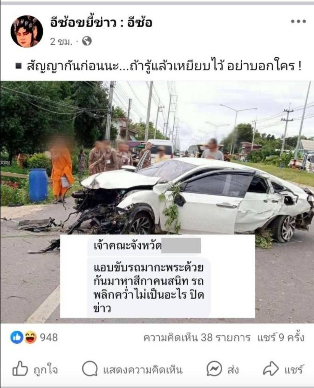จากกรณีเพจ "อีซ้อขยี้ข่าว" นำเสนอภาพอุบัติเหตุรถยนต์เก๋งสีขาวประสบอุบัติเหตุ พร้อมข้อความว่า "สัญญากันก่อนนะ...ถ้ารู้แล้วเหยียบไว้ อย่าบอกใคร!" และข้อความประกอบในภาพว่า "เจ้าคณะจังหวัด...(ขีดทับชื่อ) แอบขับรถมากับพระด้วยกันมาหาสีกาคนสนิท รถพลิกคว่ำไม่เป็นอะไร ปิดข่าว" ต่อมามีทีวีบางช่องเอาไปออกอากาศนำเสนอว่า เป็นพระชั้นผู้ใหญ่ของจ.สุโขทัย รีบขับรถเก๋งกับอีกรูปเพื่อไปหาสีกาคนสนิทแต่ประสบอุบัติเหตุแต่ปิดข่าวไว้ รวมถึงมีชาวบ้านร้องเรียน ป.ป.ช.เรื่องยักยอกเงินวัดเข้าบัญชีตัวเองแต่โดนดองเรื่องไว้, นำพระพุทธรูปออกจากวัดมหาธาตุราชวรวิหาร ศรีสัชนาลัย (วัดพระปรางค์) โดยไม่ปรึกษาชาวบ้านหรือไวยาวัจกรของวัด และยังให้สีกาเข้ามาหายามวิกาล