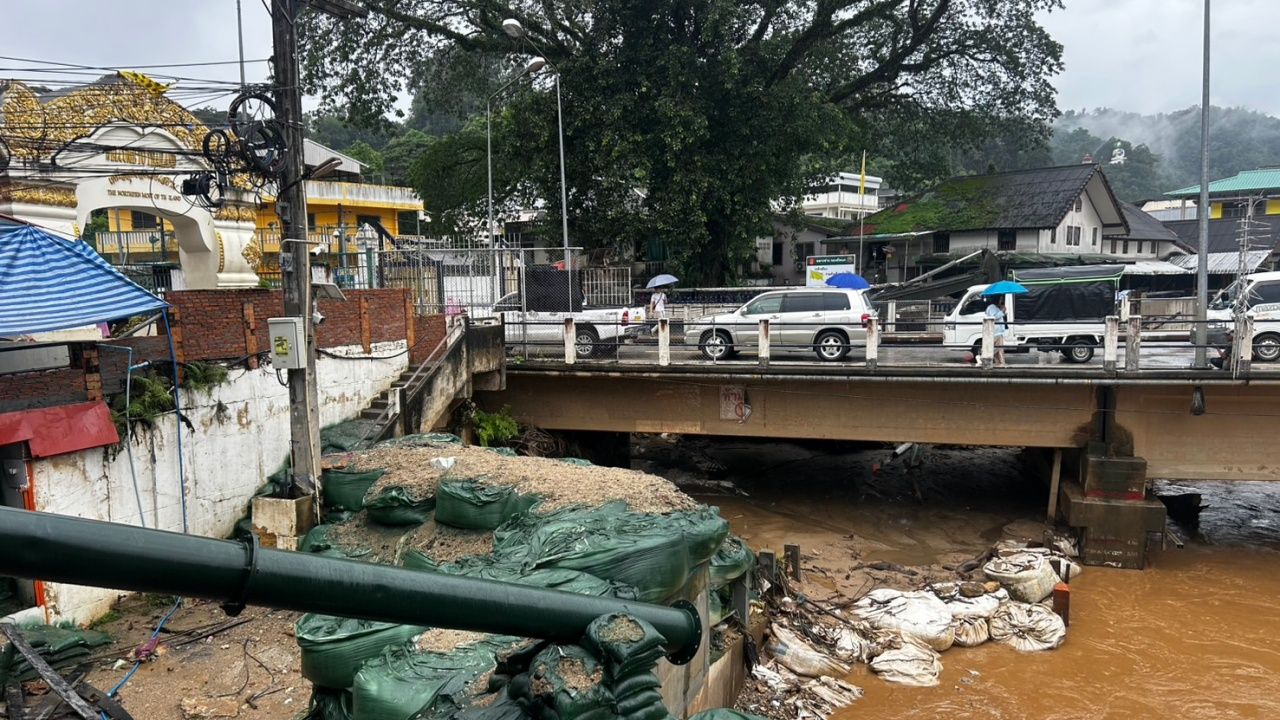 ขณะที่ระดับน้ำในลำน้ำแม่สายยังดูคงปกติแต่น้ำมีสีแดงขุ่น ซึ่งการก่อสร้างผนังป้องกันน้ำของกรมทหารช่างที่มีหลากหลายรูปแบบ ทั้งแท่งคอนกรีต กระสอบบิ๊กแบ็คที่มีความสูงกว่าระดับน้ำท่วมเมื่อเหตุการณ์ปี 2567 ที่ผ่านมา ซึ่งสามารถป้องกันน้ำป่าหลากได้