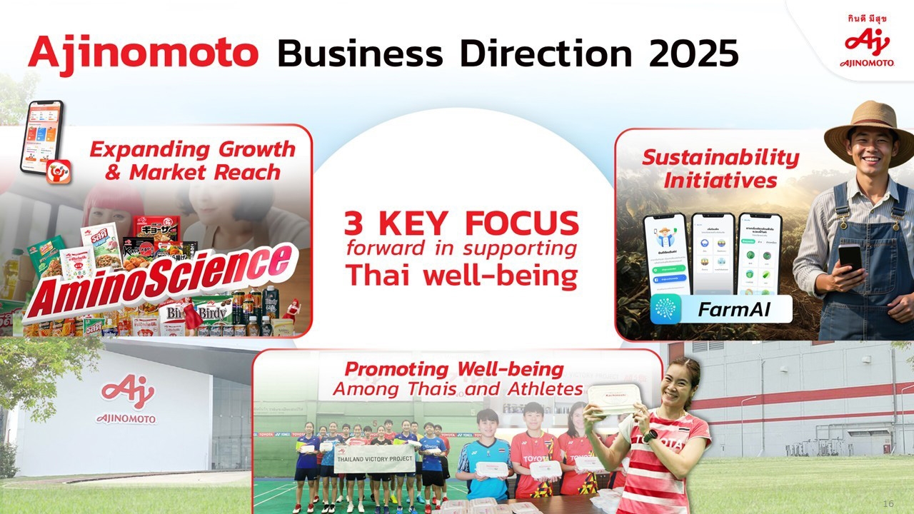 ยกระดับการสร้างความกินดีมีสุขไปอีกขั้น เมื่อบริษัท อายิโนะโมะโต๊ะ (ประเทศไทย) จำกัด ผู้นำธุรกิจอาหารในประเทศไทย กางแผนการดำเนินงานปี 68 กระตุ้นเศรษฐกิจไทย เสิร์ฟ 3 กลยุทธ์พิชิตใจคนรุ่นใหม่ 1) ขยายตลาดและสร้างการเติบโต 2) หนุนโภชนาการกีฬาให้ทัพนักกีฬาและคนไทย 3) ใช้เทคโนโลยี FarmAI ช่วยลดคาร์บอนสร้างความยั่งยืน ตั้งเป้าเติบโตอย่างต่อเนื่อง