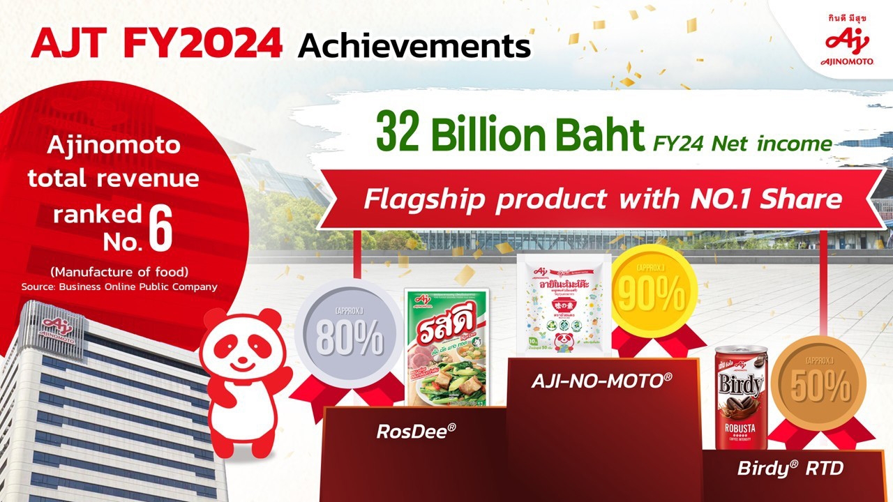 มร.อิชิโระ ซะกะกุระ กรรมการผู้จัดการใหญ่ บริษัท อายิโนะโมะโต๊ะ (ประเทศไทย) จำกัด กล่าวว่า “จากความท้าทายของธุรกิจอาหารในปีที่ผ่านมา ไม่ว่าจะเป็น ภาวะเงินเฟ้อ พฤติกรรมการใช้จ่ายของผู้บริโภค และความใส่ใจเรื่อง ESG เราได้ปรับตัวรับทุกความท้าทายและพัฒนาไปอีกขั้นเพื่อพิชิตใจคนยุคใหม่ ด้วยการส่งเสริมโภชนาการและสุขภาพที่ดีผ่าน “AminoScience” อันเป็นความเชี่ยวชาญหลักของเรา เพื่อสร้างมิติใหม่ให้กับวงการธุรกิจอาหาร โดยในปีที่ผ่านมา อายิโนะโมะโต๊ะ สร้างผลประกอบการด้วยมูลค่ากว่า 32,663 ล้านบาท ขึ้นแท่นเบอร์ 6 ของกลุ่มธุรกิจผู้ผลิตอาหารในประเทศไทย ประจำปี 2567”
