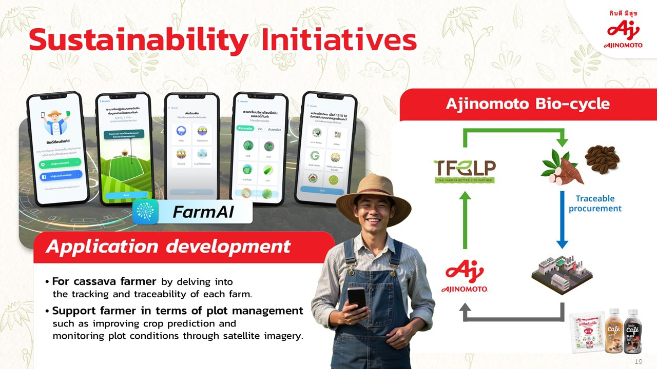 3) ใช้เทคโนโลยี FarmAI ช่วยลดคาร์บอนสร้างความยั่งยืน ตั้งเป้าลดใช้คาร์บอน พร้อมเพิ่มปริมาณการตรวจสอบกลับ (traceability) จากโครงการ “Thai Farmer Better Life Partner” ขึ้นเป็น 45,000 ตัน หรือประมาณ 30% โดยมีแอปพลิเคชัน FarmAI เป็นเครื่องมือใหม่ที่จะเข้ามาช่วยเสริมประสิทธิภาพในการตรวจสอบกลับการดำเนินงานในระบบ ecosystem พร้อมเดินหน้าโมเดล Ajinomoto FD Green one-stop service ด้วยการสร้างเครือข่ายเพื่อการเกษตรกับพาร์ตเนอร์อย่างครบวงจร ผ่านการใช้เทคโนโลยีในการยกระดับการเกษตร เพิ่มผลผลิตและให้ความรู้แก่เกษตรกรมันสำปะหลังและกาแฟเพื่อผลผลิตที่มีคุณภาพ ควบคู่กับการลดคาร์บอนตามเป้าหมายใน Scope 3