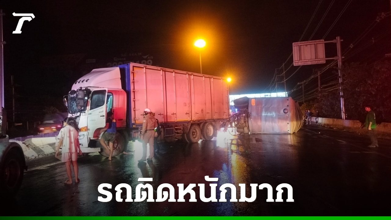 เกิดอุบัติเหตุ "รถบรรทุกพ่วง" เสียหลักชนท้าย "รถบรรทุกพ่วง" บริเวณถนนมิตรภาพ ขาเข้า ลงเนินกลางดง พลิกตะแคงกีดขวางทุกช่องทางการจราจร ทำรถติดหนักมาก