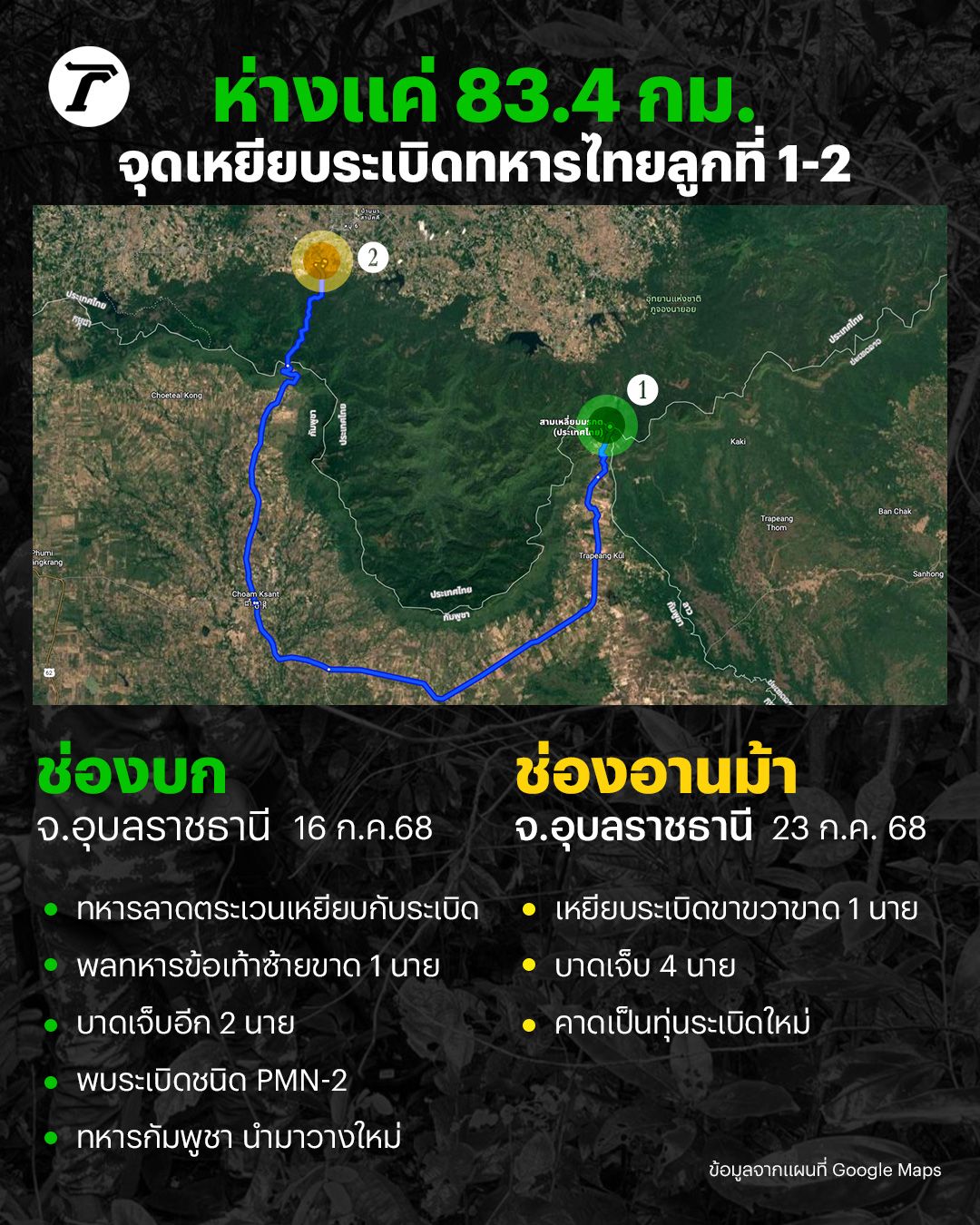 การเหยียบระเบิดของทหารไทยทั้ง 2 ครั้ง มีจุดห่างกันเพียง 83.4 กม.ดังนี้