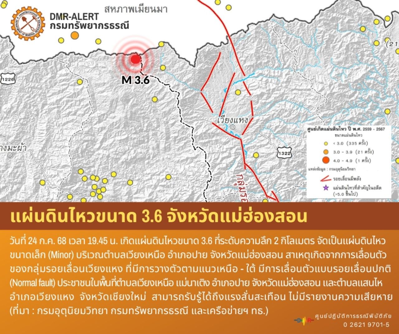 เมื่อเวลา 19.45 น. เกิดเหตุ "แผ่นดินไหวแม่ฮ่องสอน" ขนาด 3.6 บริเวณตำบลเวียงเหนือ อำเภอปาย ประชาชนรับรู้ได้ถึงแรงสั่นสะเทือน