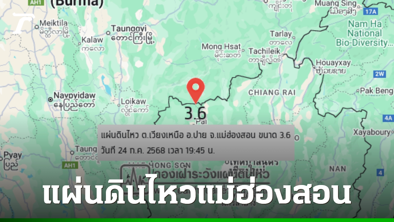 วันที่ 24 ก.ค. 2568 เวลา 19.45 น. เกิดแผ่นดินไหวขนาด 3.6 ที่ระดับความลึก 2 กิโลเมตร จัดเป็นแผ่นดินไหวขนาดเล็ก (Minor) บริเวณตำบลเวียงเหนือ อำเภอปาย จังหวัดแม่ฮ่องสอน
