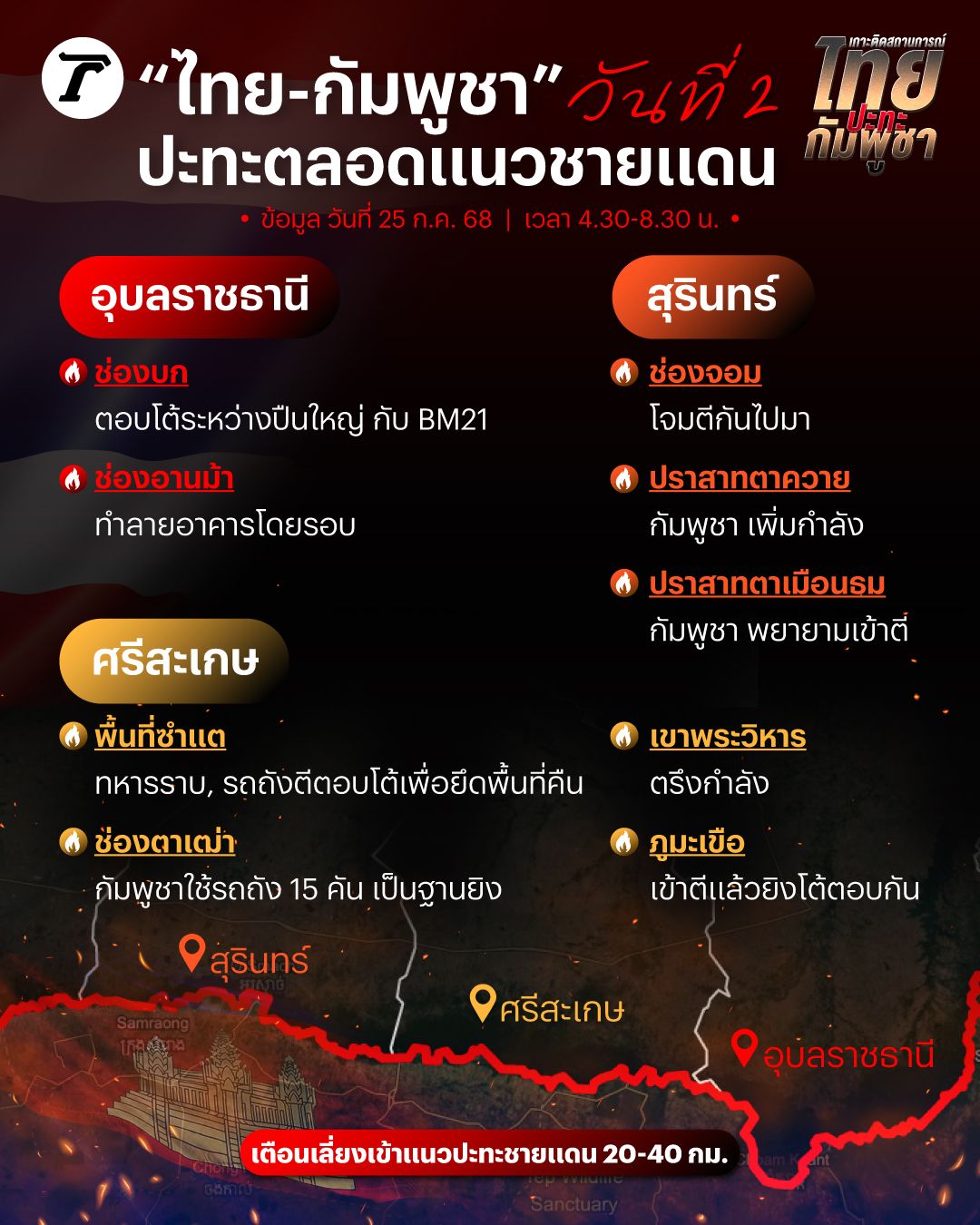 การปะทะกันของไทย-กัมพูชา เข้าสู่วันที่ 2 ตลอดแนวชายแดน ทำให้ทหารและประชาชนสูญเสียจำนวนมาก มีรายงานการเผชิญหน้ากันตั้งแต่รุ่งสางวันนี้ 25 ก.ค.68 เวลา 4.30 - 8.30 น. ทางการไทยได้อพยพชาวบ้านแนวชายแดน พร้อมเตือนให้เลี่ยงเข้าแนวปะทะชายแดน 20-40 กม. ขณะนานาชาติเรียกร้องให้มีการหยุดยิง เพื่อนำสู่การเจรจาลดความสูญเสียของทั้งสองฝ่าย
