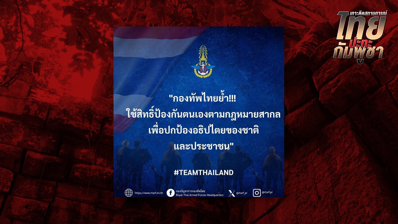 กองทัพไทย ประณามกัมพูชา ละเมิดข้อตกลงหยุดยิง โจมตีไทยต่อเนื่องในหลายจุด บ่อนทำลายความเชื่อมั่นที่ควรมีต่อกันในฐานะประเทศเพื่อนบ้าน ย้ำไทยมีความจำเป็นต้องใช้มาตรการโต้กลับ ภายใต้สิทธิในการป้องกันตนเองตามหลักกฎหมายสากล