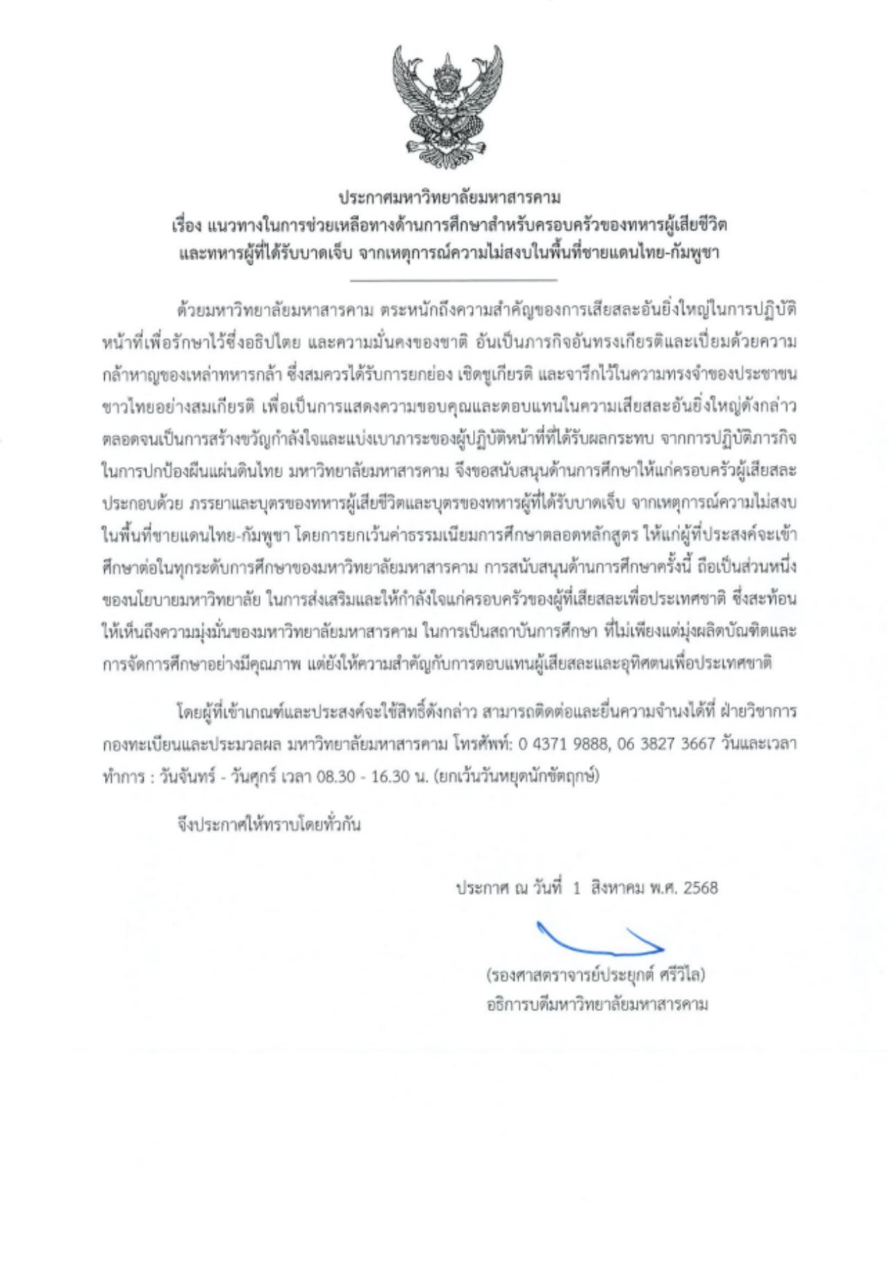 มมส. ประกาศยกเว้นค่าเทอมตลอดหลักสูตร ให้แก่ "ครอบครัวทหาร" ผู้เสียชีวิต-บาดเจ็บ จากสถาการณ์ชายแดนไทย-กัมพูชา ที่ประสงค์จะเข้าศึกษาต่อในทุกระดับการศึกษาของมหาวิทยาลัย