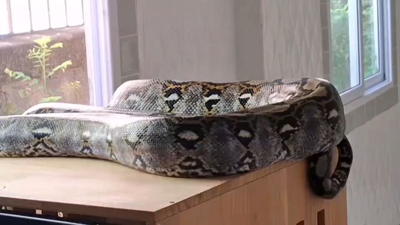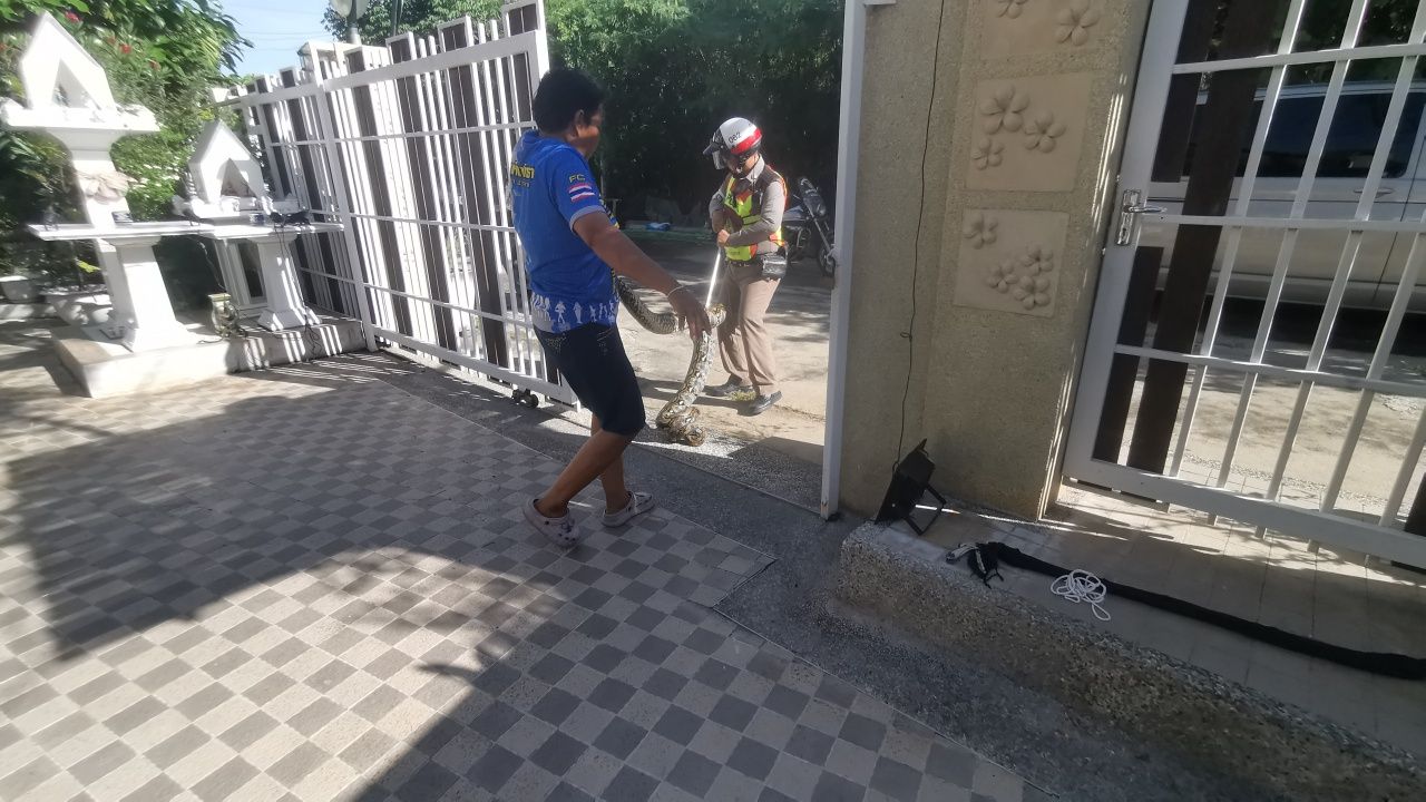 เมื่อเวลา 09.00 น. วันที่ 5 ส.ค. 68 นายวิโรจน์ บุญไทย อายุ 52 ปี และ น.ส.บุปผา อ่ำพ่วง อายุ 53 ปี เจ้าหน้าที่ศูนย์ป้องกันและบรรเทาสาธารณภัย 191 จ.นนทบุรี ได้รับแจ้งจากประชาชนขอความช่วยเหลือ ว่ามีงูขนาดใหญ่ตกลงมาจากฝ้าเพดานขดตัวอยู่บนตู้เก็บของภายในห้อง ที่หมู่บ้านธนากร ต.บางแม่นาง อ.บางใหญ่ จ.นนทบุรี จึงนำอุปกรณ์ในการจับสัตว์เข้าตรวจสอบ