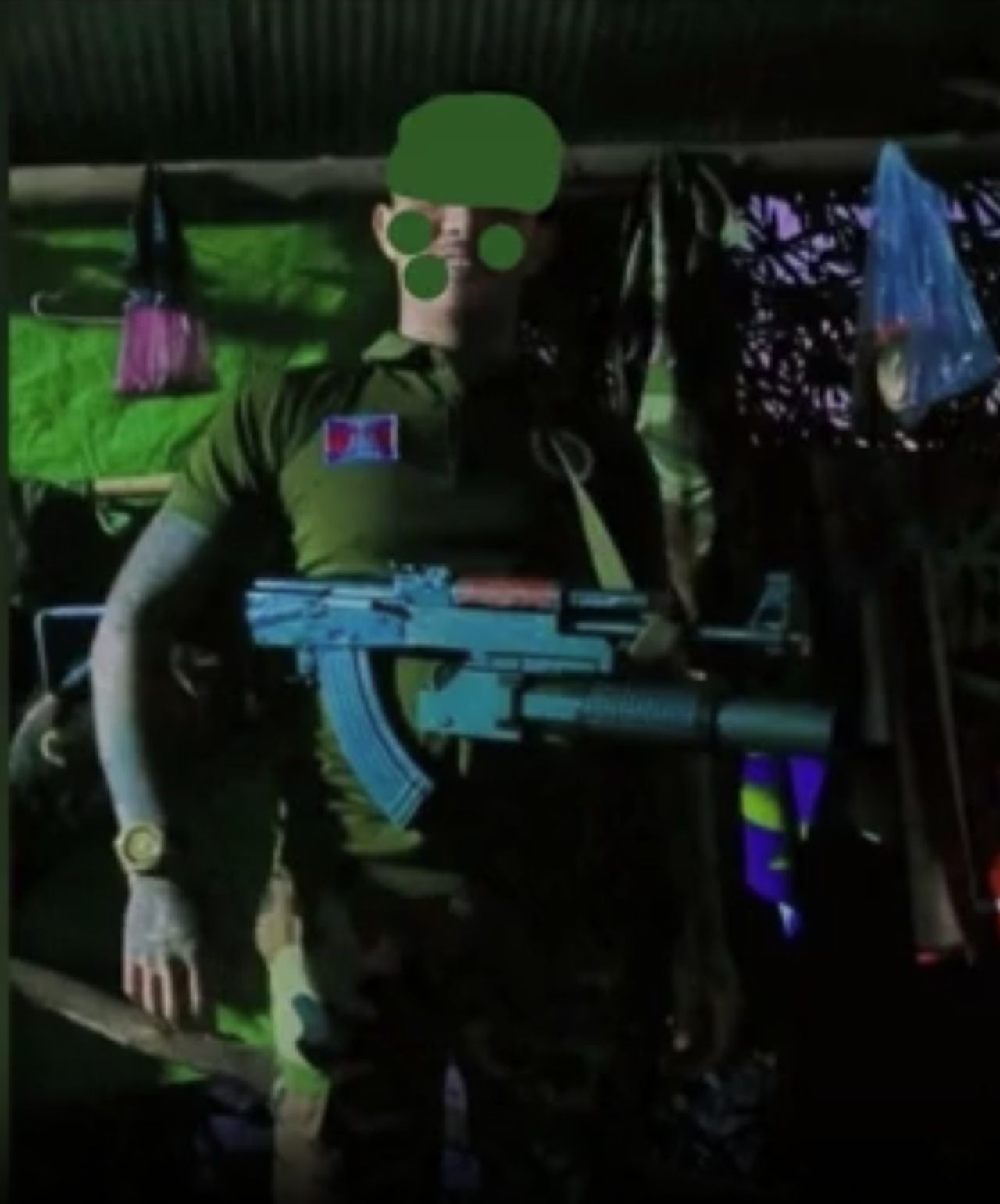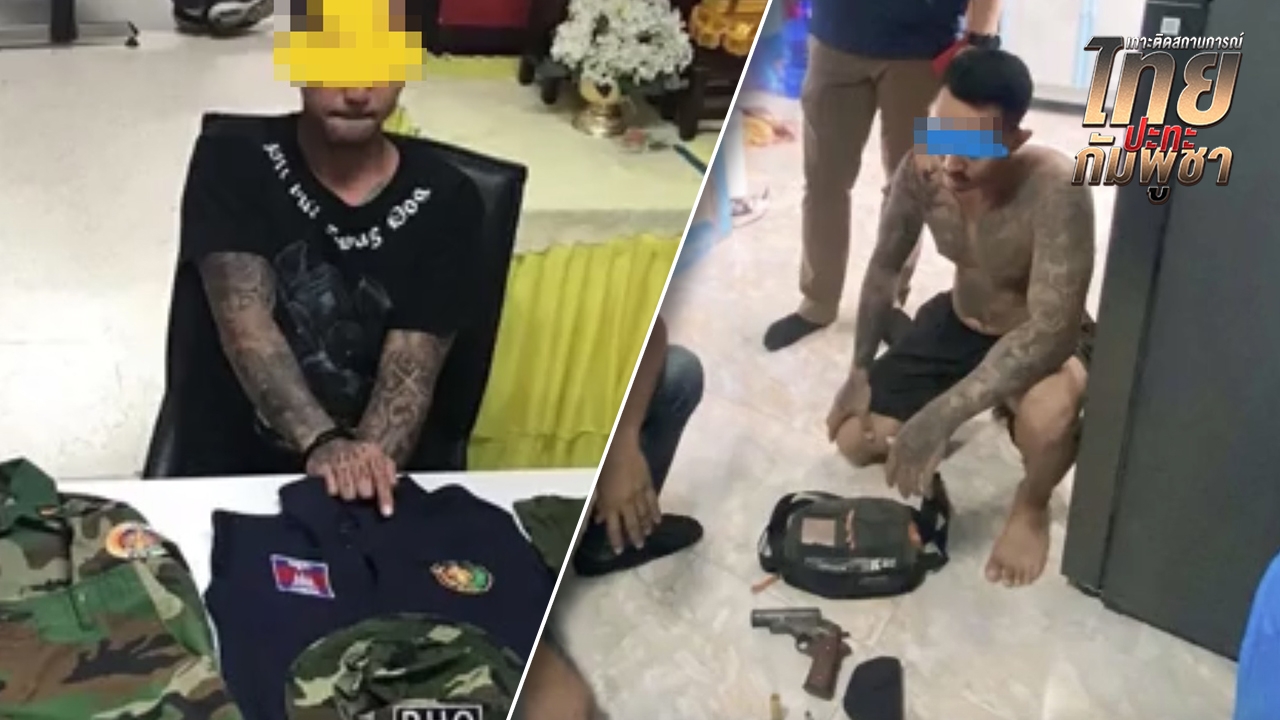 พร้อมของกลางอาวุธปืนไทยประดิษฐ์ 1 กระบอก เครื่องแบบทหารลายพราง ติดธงกัมพูชา และติดโลโก้หน่วย BHQ หรือกองบัญชาการองครักษ์พิทักษ์ฮุนเซน
