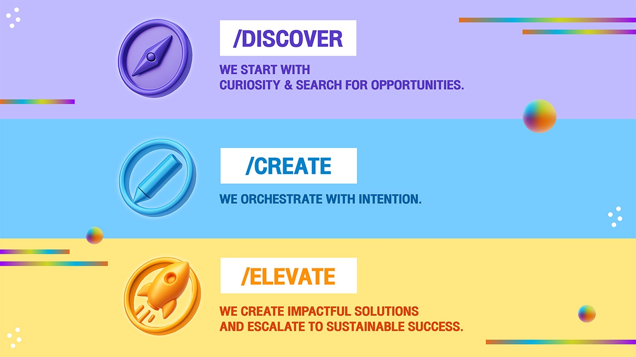 ที่กำลังจะเกิดอีกเรื่อย ๆ ในอนาคต เพื่อให้แบรนด์ประสบความสำเร็จ และนี่คือมิติใหม่ ที่เราสร้างแนวคิดการทำงาน ภายใต้ Work Code: Discover • Create • Elevate