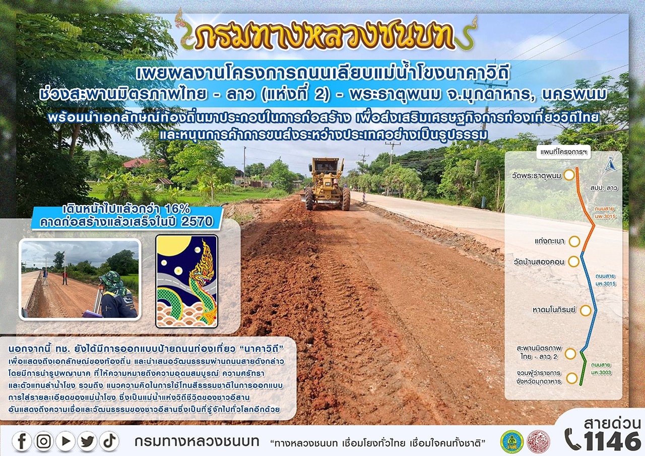 กรมทางหลวงชนบทเผยผลงานโครงการถนนเลียบแม่น้ำโขงนาคาวิถี ช่วงสะพานมิตรภาพไทย - ลาว (แห่งที่ 2) - พระธาตุพนม จ.มุกดาหาร, นครพนม เดินหน้าไปแล้วกว่า 16% คาดก่อสร้างแล้วเสร็จในปี 2570 พร้อมนำเอกลักษณ์ท้องถิ่นมาประกอบในการก่อสร้าง เพื่อส่งเสริมเศรษฐกิจการท่องเที่ยววิถีไทย และหนุนการค้าการขนส่งระหว่างประเทศอย่างเป็นรูปธรรม