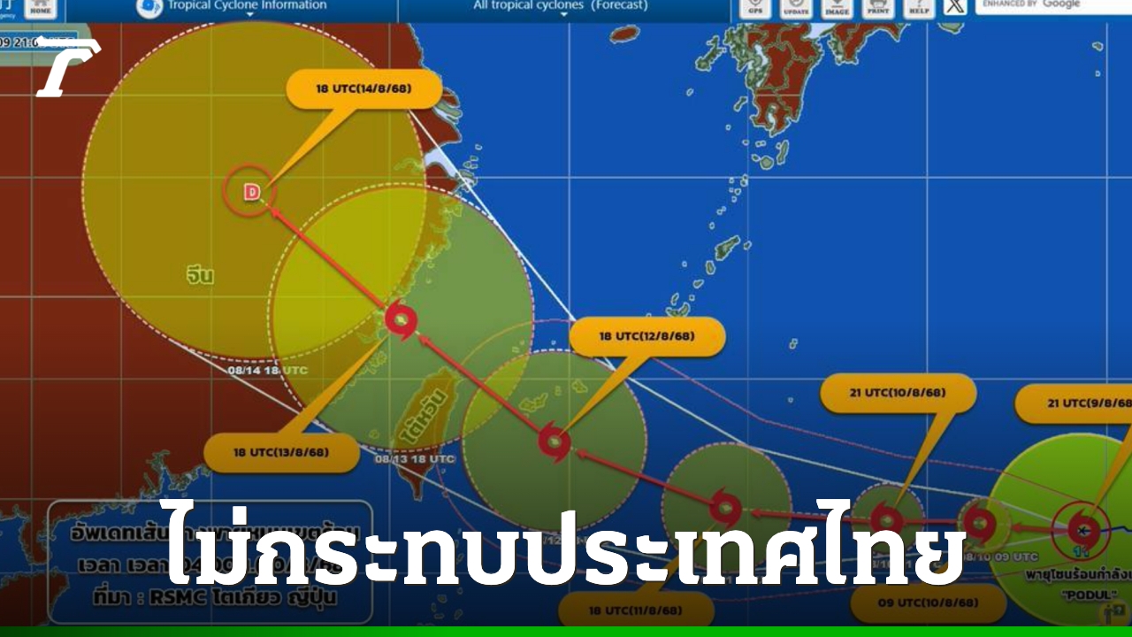 อัปเดตเส้นทาง พายุโซนร้อนกำลังแรง "โพดุล" กำลังเคลื่อนตัวทางตะวันตกไปทางเกาะไต้หวัน โดยไม่เคลื่อนเข้าสู่ประเทศไทย