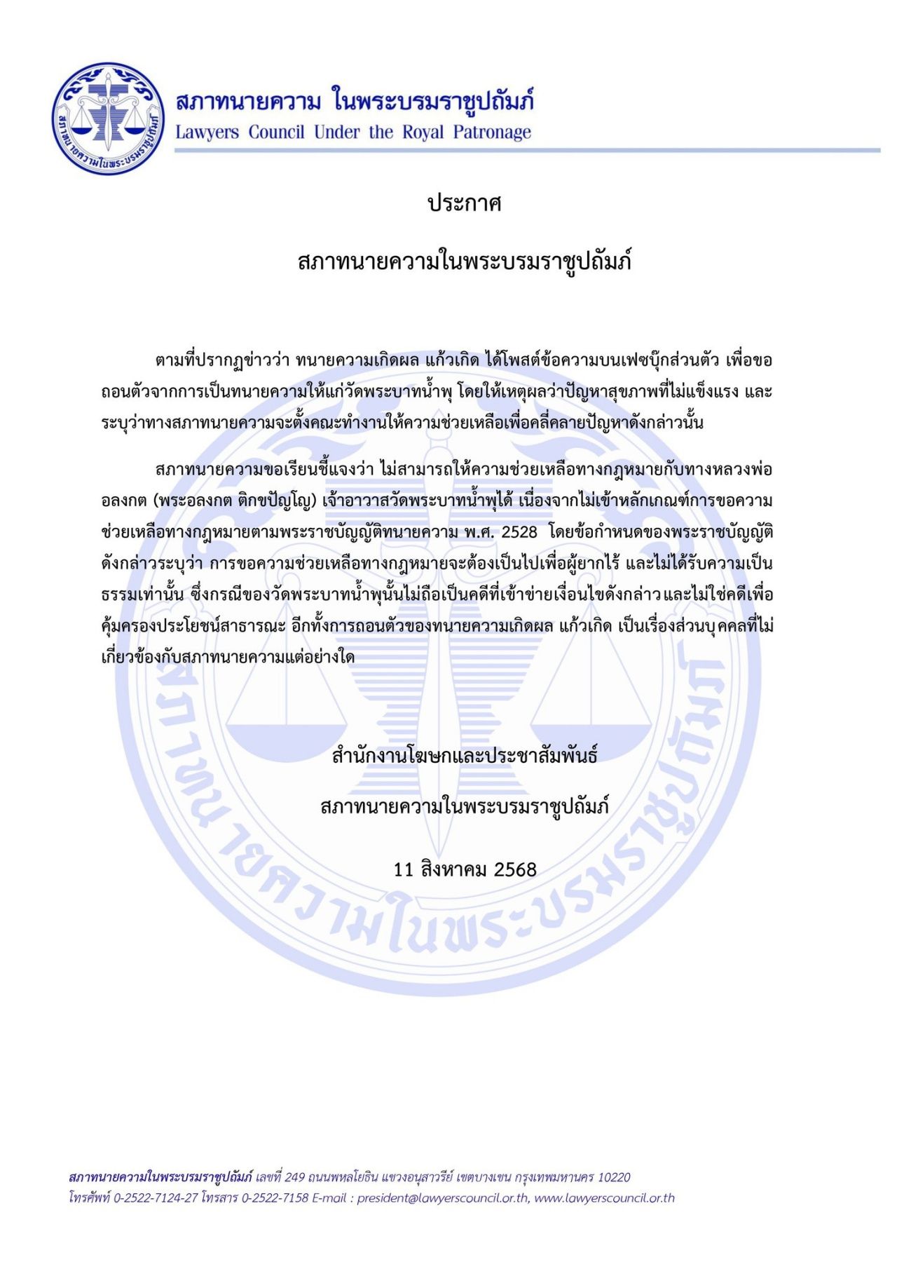 วันที่ 11 สิงหาคม 2568 สภาทนายความในพระบรมราชูปถัมภ์ เผยแพร่ประกาศระบุว่า ตามที่ปรากฏข่าวว่า ทนายความเกิดผล แก้วเกิด ได้โพสต์ข้อความบนเฟซบุ๊กส่วนตัว เพื่อขอถอนตัวจากการเป็นทนายความให้แก่วัดพระบาทน้ำพุ โดยให้เหตุผลว่าปัญหาสุขภาพที่ไม่แข็งแรง และระบุว่าทางสภาทนายความจะตั้งคณะทำงานให้ความช่วยเหลือเพื่อคลี่คลายปัญหาดังกล่าวนั้น
