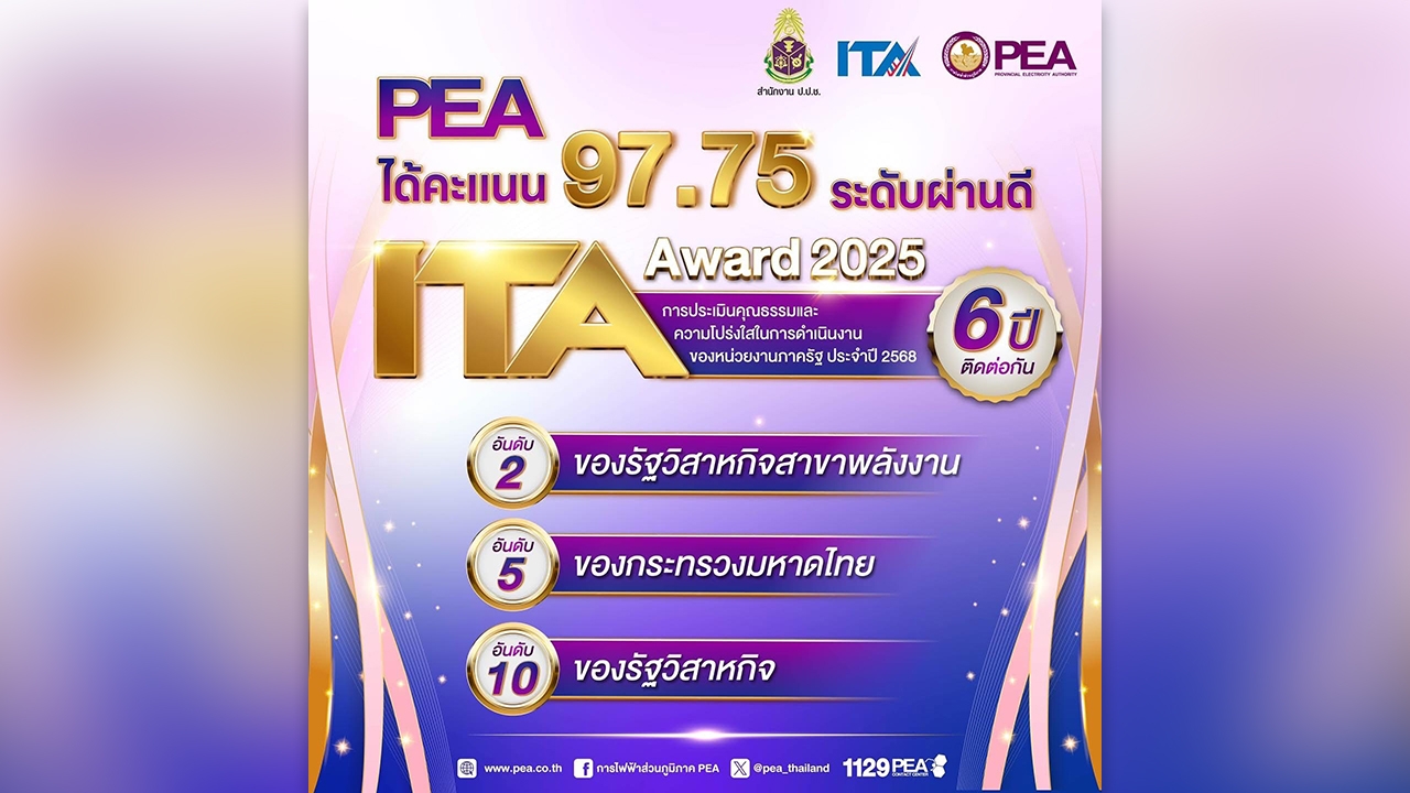 การไฟฟ้าส่วนภูมิภาค (PEA) ได้รับผลคะแนนประเมิน 97.75 คะแนน จากการประเมินคุณธรรมและความโปร่งใสในการดำเนินงานของหน่วยงานภาครัฐ ประจำปี 2568 เป็นอันดับ 2 ของรัฐวิสาหกิจสาขาพลังงาน อันดับที่ 5 ของกระทรวงมหาดไทย และอันดับ 10 ของรัฐวิสาหกิจที่เข้ารับการประเมิน ซึ่ง PEA ได้รับคะแนนมากกว่า 95 คะแนน เป็นเวลา 6 ปีติดต่อกัน