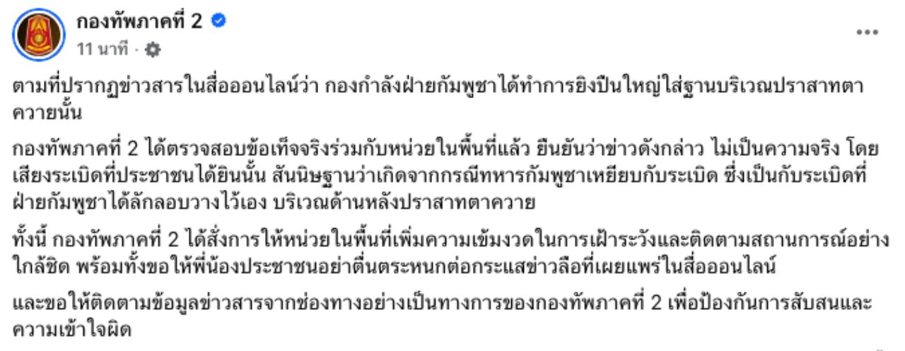 กองทัพภาคที่ 2 ได้ตรวจสอบข้อเท็จจริงร่วมกับหน่วยในพื้นที่แล้ว ยืนยันว่าข่าวดังกล่าวไม่เป็นความจริง โดยเสียงระเบิดที่ประชาชนได้ยินนั้น สันนิษฐานว่าเกิดจากกรณีทหารกัมพูชาเหยียบกับระเบิด ซึ่งเป็นกับระเบิดที่ฝ่ายกัมพูชาได้ลักลอบวางไว้เอง บริเวณด้านหลังปราสาทตาควาย