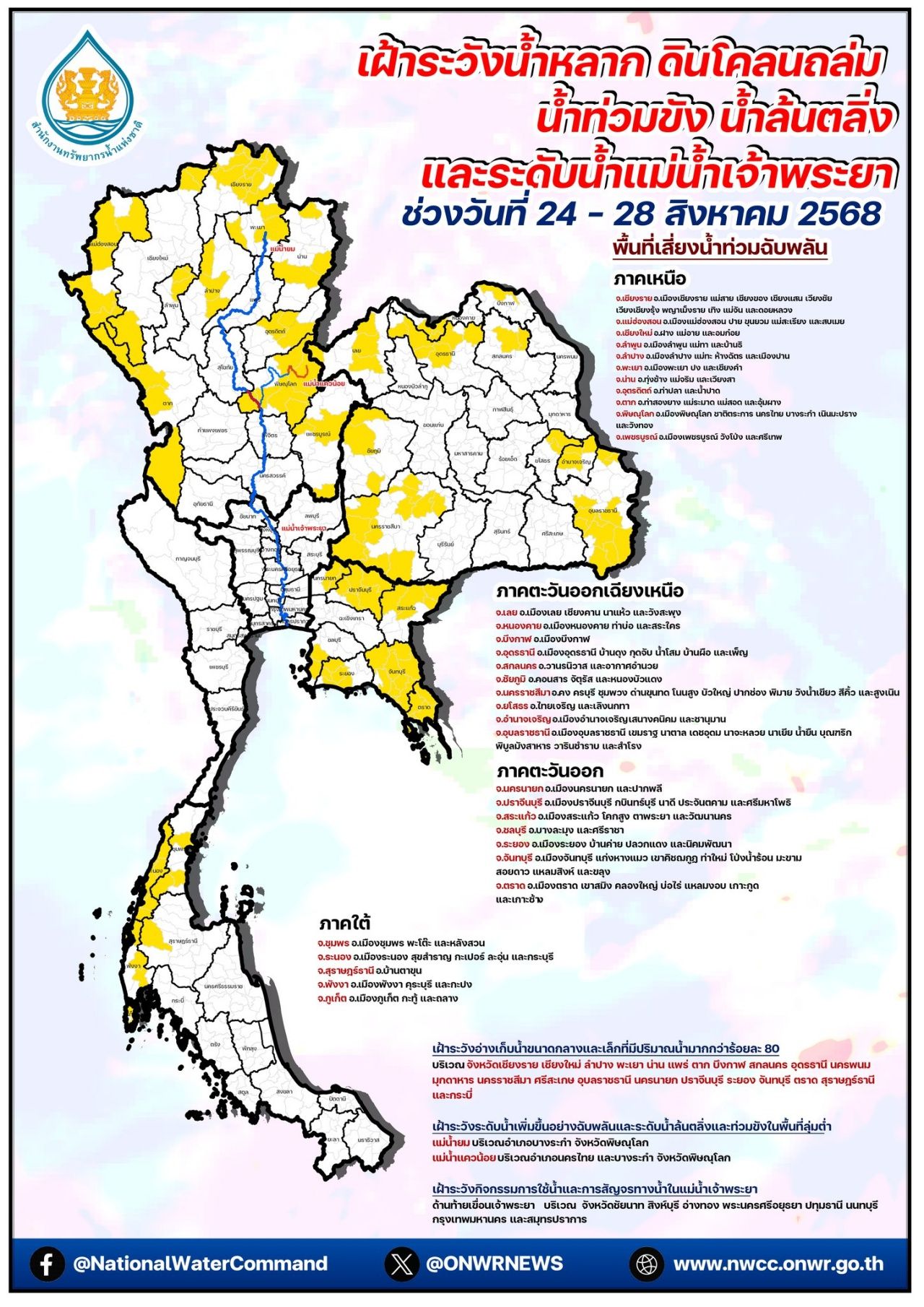 โดยระบุว่า สำนักงานทรัพยากรน้ำแห่งชาติ (สทนช.) ได้ติดตามการคาดการณ์สภาพอากาศพบว่า จะมีฝนตกหนักถึงหนักมากบางแห่ง ทั้งนี้ สทนช. ได้ประเมินวิเคราะห์สภาพอากาศ สถานการณ์น้ำ และคาดการณ์พื้นที่เสี่ยงน้ำหลาก ดินโคลนถล่ม ร่วมกับกรมอุตุนิยมวิทยา สถาบันสารสนเทศทรัพยากรน้ำ (องค์การมหาชน) กรมทรัพยากรน้ำ กรมทรัพยากรธรณี กรมชลประทาน การไฟฟ้าฝ่ายผลิตแห่งประเทศไทย และกรมป้องกันและบรรเทาสาธารณภัย พบว่ามีพื้นที่บางส่วนเสี่ยงต้องเฝ้าระวังน้ำท่วมฉับพลัน น้ำป่าไหลหลาก ดินโคลนถล่ม น้ำท่วมขังในเขตชุมชนเมืองที่เกิดน้ำท่วมขังอยู่เป็นประจำ เนื่องจากระบายน้ำไม่ทัน ในช่วงวันที่ 24 - 28 สิงหาคม 2568 ดังนี้
