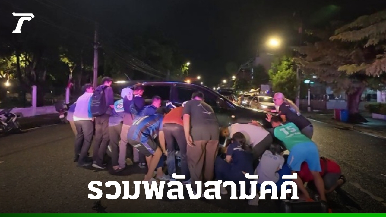 ชาวบ้านรวมพลังสามัคคี ช่วยกันยก "รถยนต์-รถจักรยานยนต์" ขณะกำลังทับขาหนุ่มวัย 20 ปี หลังเกิดอุบัติเหตุรถชน จนมุดเข้าไปอยู่ใต้ท้องรถและถูกกดทับเอาไว้