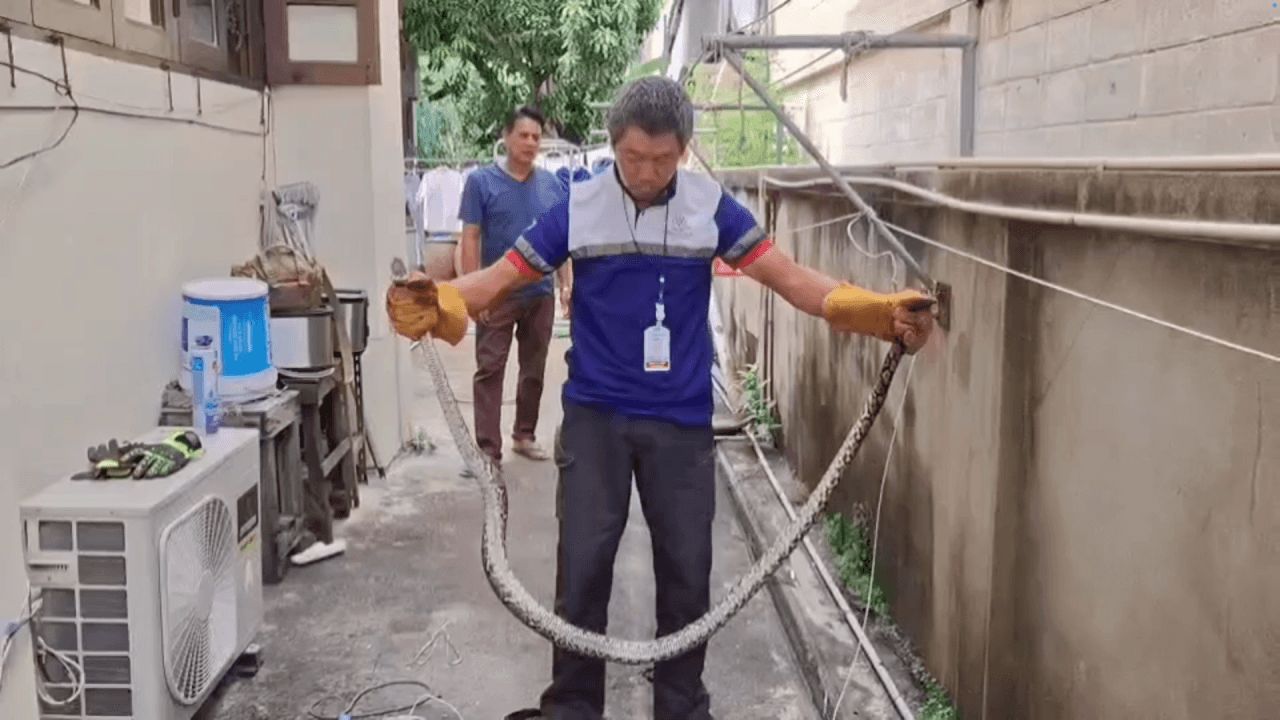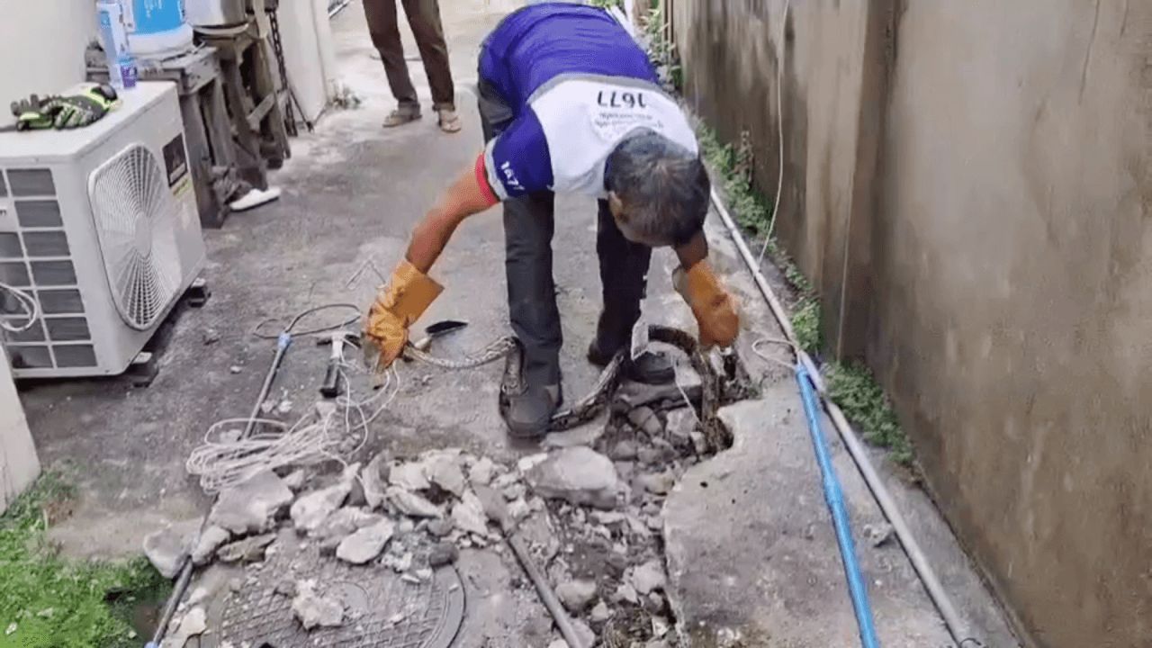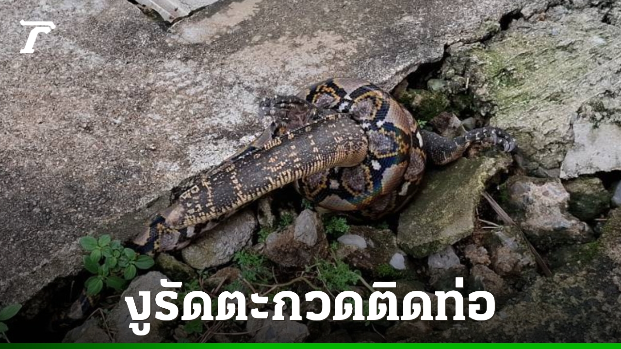 ชาวบ้านแจ้งกู้ภัยช่วยจับงูเหลือมหิวจัด รัดตะกวดหวังจะลากไปกินในรู แต่ตัวติดท่อลงไปไม่ได้ สุดท้ายเจ้าหน้าที่ต้องทุบพื้นปูน จึงสามารถนำงูออกมาได้