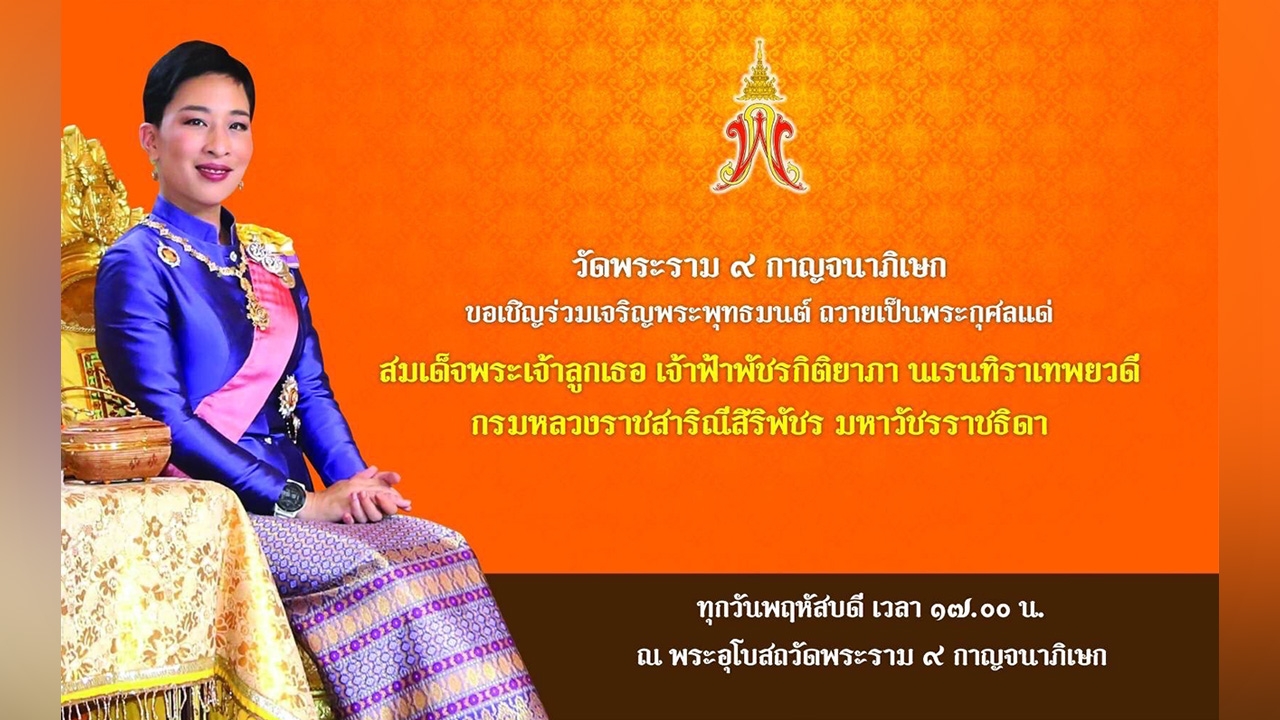 วัดพระราม 9 กาญจนาภิเษก เชิญชวนพุทธศาสนิกชน ร่วมเจริญพระพุทธมนต์ ถวายเป็นพระกุศล "สมเด็จพระเจ้าลูกเธอ เจ้าฟ้าพัชรกิติยาภา นเรนทิราเทพยวดี กรมหลวงราชสาริณีสิริพัชร มหาวัชรราชธิดา"