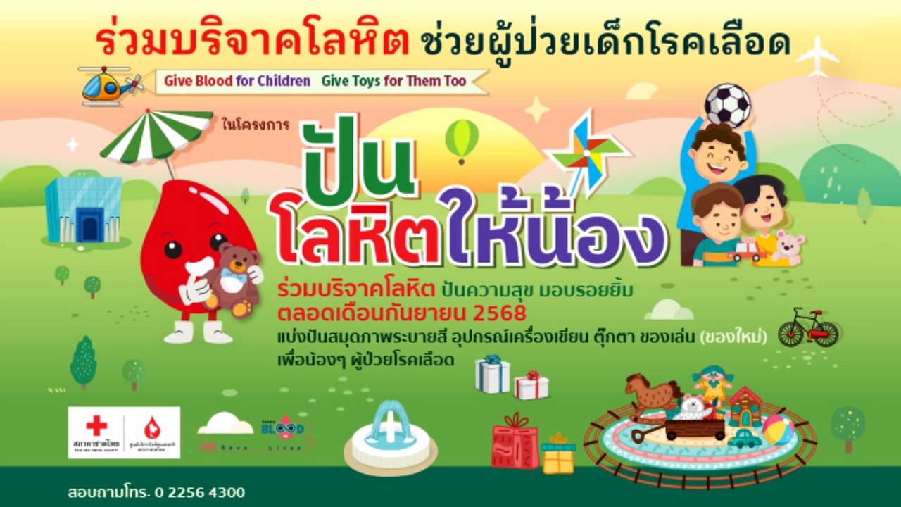 ศูนย์บริการโลหิตแห่งชาติ สภากาชาดไทย ร่วมกับ สมาคมนักศึกษาเก่าพาณิชยศาสตร์และการบัญชี มหาวิทยาลัยธรรมศาสตร์ ชวนผู้ใจบุญเติมเต็มโลหิตคงคลัง บริจาคโลหิตช่วยเด็กป่วยโรคเลือด ในโครงการ “ปันโลหิต ให้น้อง” Give blood for children ตลอดเดือนกันยายน 2568 พร้อมแบ่งปันของเล่น อุปกรณ์เครื่องเขียน สมุดวาดภาพระบายสี ให้เด็กป่วยโรคเลือด ตั้งแต่วันนี้ - 30 กันยายน 2568 ได้ที่ ศูนย์บริการโลหิตแห่งชาติ ถนนอังรีดูนังต์ พิเศษ ! ผู้บริจาคโลหิตในวันที่ 9 กันยายน 2568 ณ ศูนย์บริการโลหิตแห่งชาติ และโรงพยาบาลธรรมศาสตร์ ฯ จะได้รับเสื้อยืดเป็นที่ระลึก