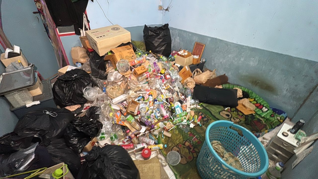ทันทีที่เปิดประตูเข้าไป กลับพบภาพที่ชวนอึ้ง กองขยะสูงท่วมเกือบครึ่งห้อง ทั้งกล่องโฟมใส่อาหาร ขวดพลาสติก กระป๋อง และถุงขยะสีดำกองพะเนิน กระจัดกระจายไปทั่วจนแทบไม่มีที่เดิน ส่วนที่นอนก็ถูกกลบด้วยซากขยะและคราบสกปรก กลายเป็นสภาพไม่ต่างจากบ่อขยะย่อม ๆ ส่วนห้องน้ำแทบไม่เคยถูกทำความสะอาด โถส้วมเต็มไปด้วยคราบเหลืองและร่องรอยการใช้งานสะสมมานาน อ่างเก็บน้ำและผนังห้องมีคราบเชื้อราเกาะหนา ส่งกลิ่นเหม็นรุนแรงจนแทบหายใจไม่ออก