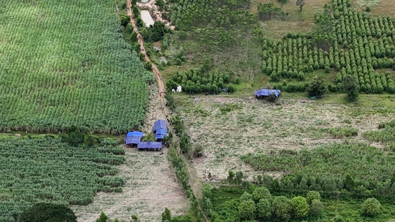 ความคืบหน้าสถานการณ์ชายแดนไทย-กัมพูชา เมื่อเวลา 14.00 น. วันที่ 5 กันยายน 2568 ผู้สื่อข่าวรายงาน จากภาพมุมสูงที่บันทึกได้บริเวณบ้านหนองจาน ถนน 58 และแนวรั้วชายแดน อำเภอโคกสูง จังหวัดสระแก้ว พบว่าพื้นที่ดังกล่าวยังคงมีความตึงเครียดและมีความเคลื่อนไหวอย่างต่อเนื่อง ยังคงมีชาวกัมพูชาเดินทางเข้ามายังจุดหน้าแนวไม่ขาดสาย ถึงแม้ว่าอาจจะไม่มากนัก ซึ่งคาดว่าด้วยอากาศที่แปรปรวนทั้งร้อน-ทั้งฝน