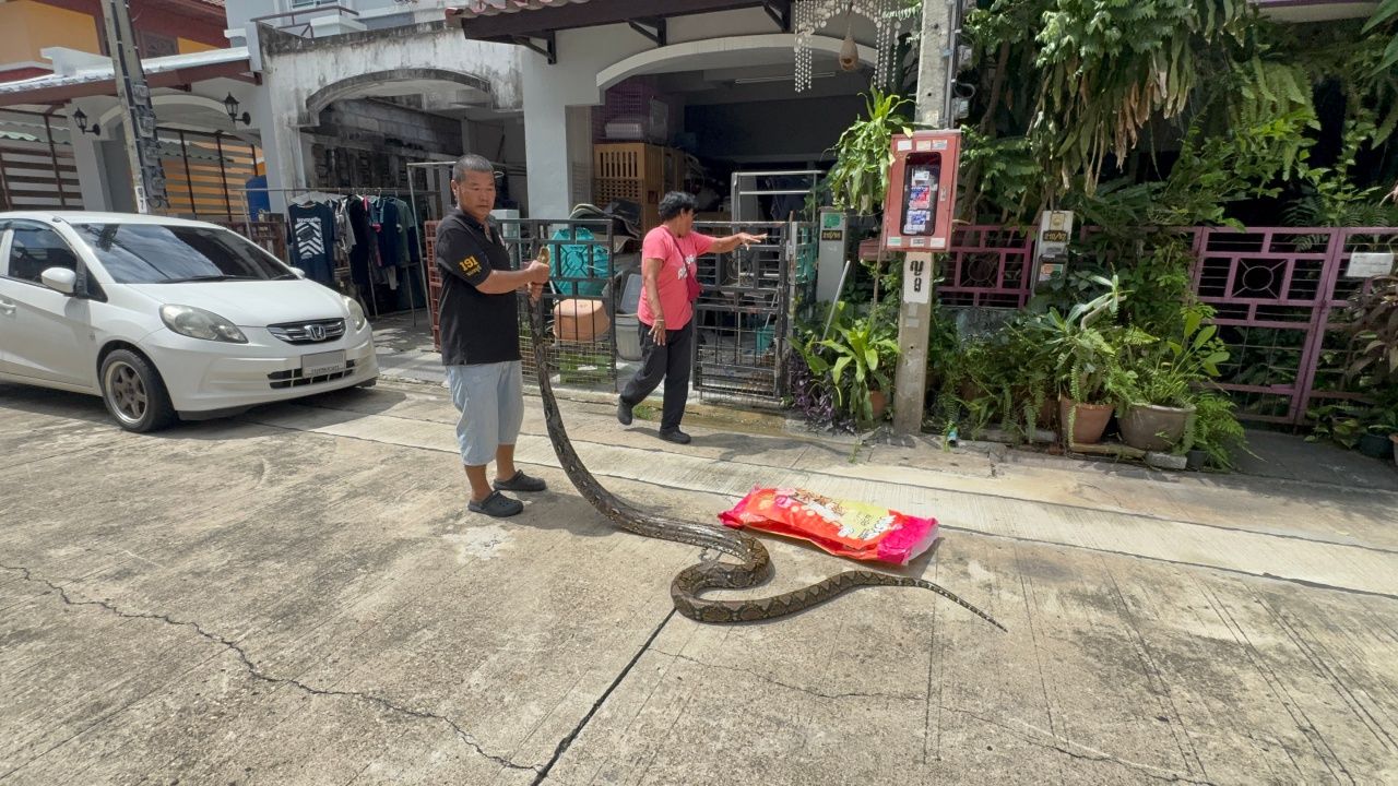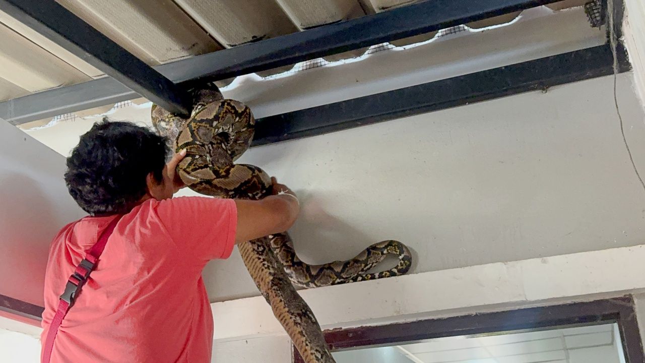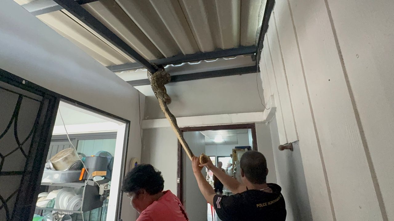 ภายในบ้านพบงูเหลือมขนาดใหญ่ความยาวเกือบ 5 เมตร พันขดตัวอยู่กับคานเหล็กหลังคาในครัว ทางเจ้าหน้าที่จึงใช้อุปกรณ์จับงูเหลือมตัวดังกล่าวลงมาจากคานได้สำเร็จ ก่อนจะนำไปปล่อยยังแหล่งธรรมชาติต่อไป