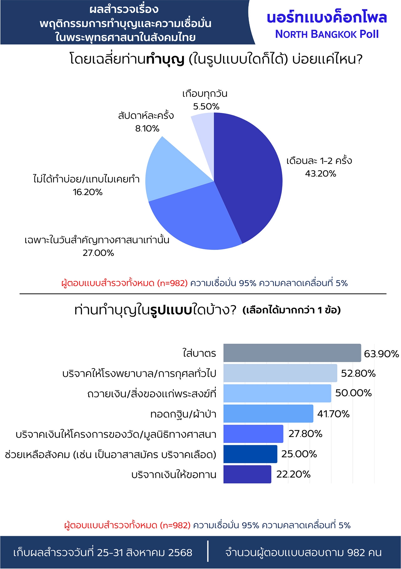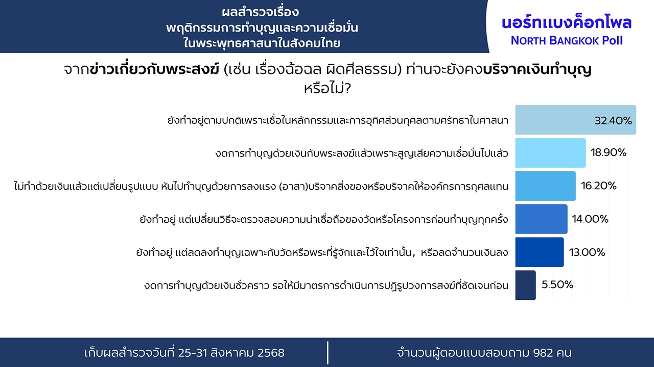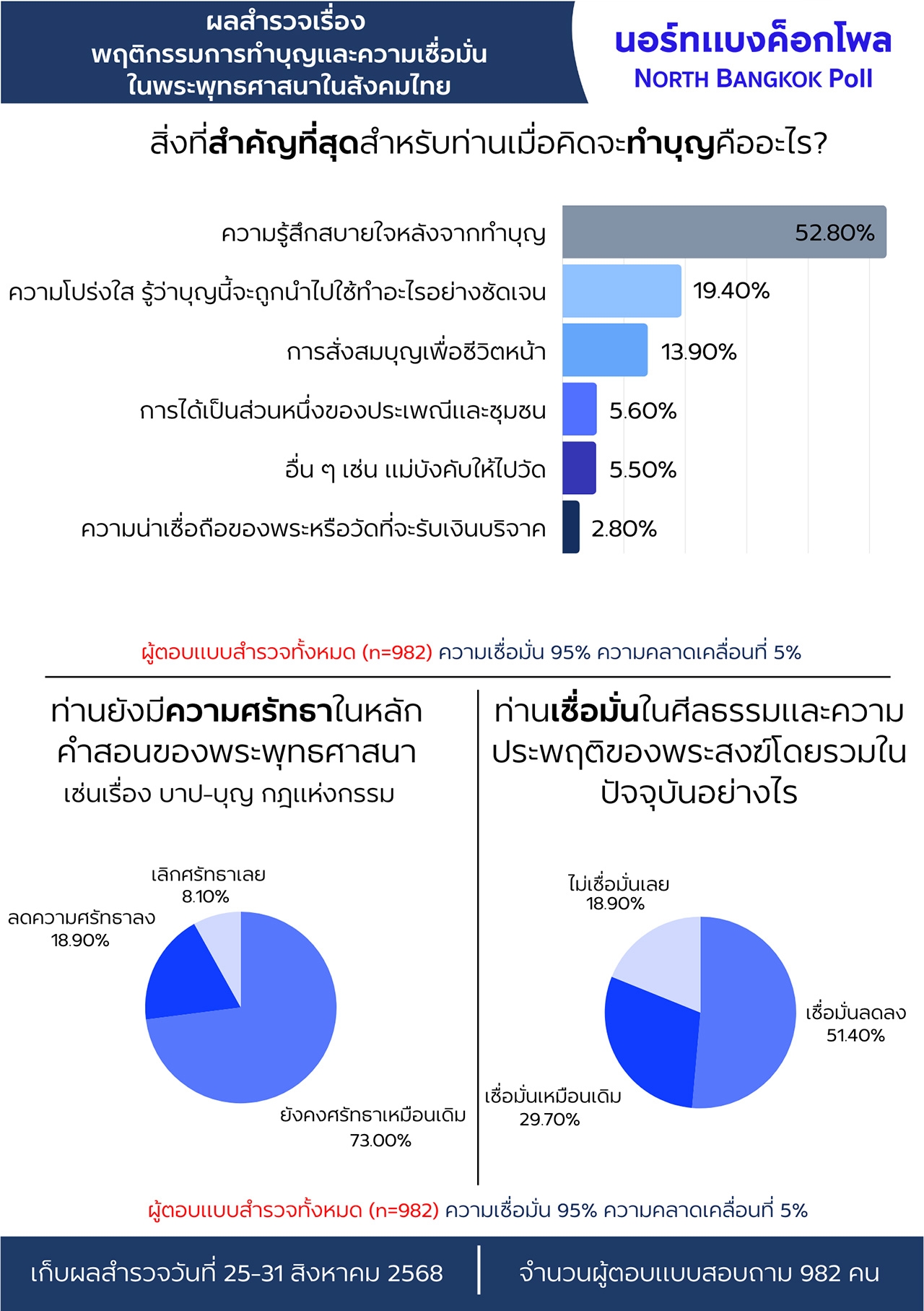ผศ. ดร. สานิต ศิริวิศิษฐ์กุล หัวหน้าศูนย์สำรวจความคิดเห็น นอร์ทแบงค็อกโพล มหาวิทยาลัยนอร์ทกรุงเทพเปิดเผยว่า จากการสำรวจความคิดเห็นของประชาชน ระหว่างวันที่ 25-31 สิงหาคม 2568 จากจำนวน 982 ตัวอย่าง จากกลุ่มตัวอย่างทุกภูมิภาคทั่วประเทศในประเด็น “พฤติกรรมการทำบุญและความเชื่อมั่นในพระพุทธศาสนาในสังคมไทย” ต่อข้อคำถาม