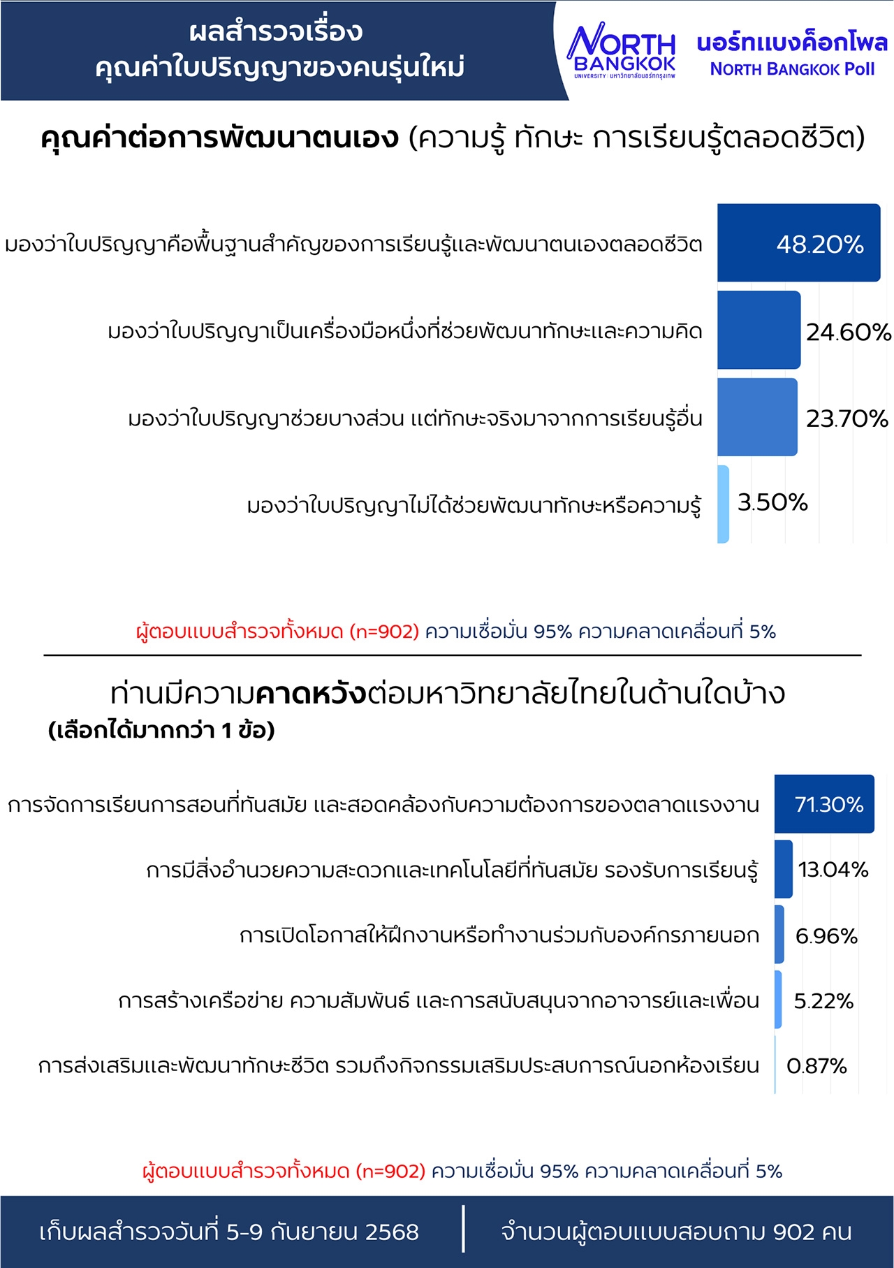 คุณค่าต่อการพัฒนาตนเอง (ความรู้ ทักษะ การเรียนรู้ตลอดชีวิต) พบว่ามองว่าใบปริญญาคือพื้นฐานสำคัญของการเรียนรู้และพัฒนาตนเองตลอดชีวิต ร้อยละ 48.20 มองว่าใบปริญญาเป็นเครื่องมือหนึ่งที่ช่วยพัฒนาทักษะและความคิด ร้อยละ 24.60 มองว่าใบปริญญาช่วยบางส่วน แต่ทักษะจริงมาจากการเรียนรู้อื่น ร้อยละ 23.70 และ มองว่าใบปริญญาไม่ได้ช่วยพัฒนาทักษะหรือความรู้ ร้อยละ 3.50