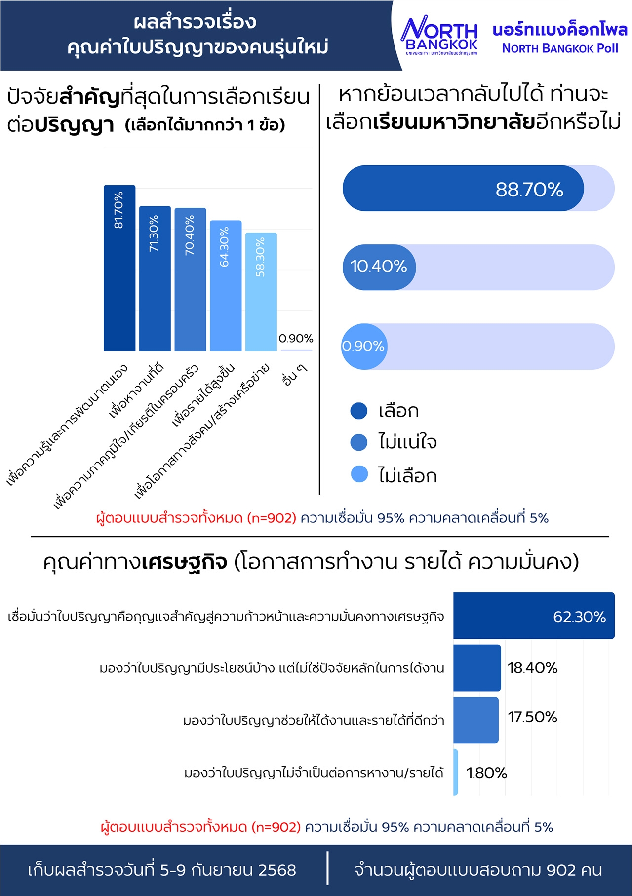 ผศ.ดร.สานิต ศิริวิศิษฐ์กุล หัวหน้าศูนย์สำรวจความคิดเห็นนอร์ทแบงค็อกโพล สำนักวิจัย มหาวิทยาลัยนอร์ทกรุงเทพ เปิดเผยว่า จากการสำรวจความคิดเห็นของนักศึกษาในประเด็นคุณค่าใบปริญญาของคนรุ่นใหม่ ระหว่างวันที่ 5 – 9 กันยายน 2568 จากจำนวน 902 ตัวอย่าง โดยเป็นนักศึกษาจากกรุงเทพฯ และปริมณฑล ที่ค่าความเชื่อมั่นร้อยละ 95