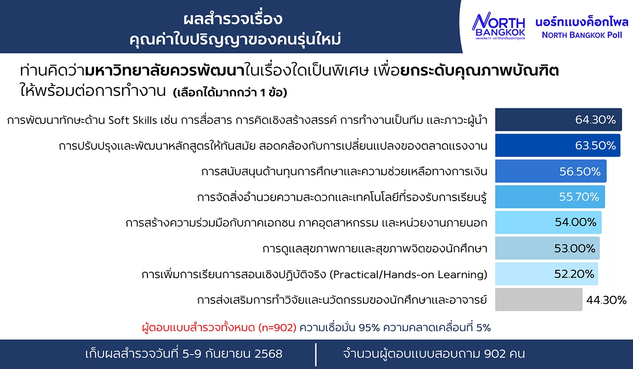 ท่านคิดว่ามหาวิทยาลัยควรพัฒนาในเรื่องใดเป็นพิเศษ เพื่อยกระดับคุณภาพบัณฑิตให้พร้อมต่อการทำงาน พบว่าเห็นว่ามหาวิทยาลัยควรพัฒนาทักษะด้าน Soft Skills เช่น การสื่อสาร การคิดเชิงสร้างสรรค์ การทำงานเป็นทีม และภาวะผู้นำ ร้อยละ 64.30 การปรับปรุงและพัฒนาหลักสูตรให้ทันสมัย สอดคล้องกับการเปลี่ยนแปลงของตลาดแรงงาน ร้อยละ 63.50 การสนับสนุนด้านทุนการศึกษาและความช่วยเหลือทางการเงิน ร้อยละ 56.50 การจัดสิ่งอำนวยความสะดวกและเทคโนโลยีที่รองรับการเรียนรู้ ร้อยละ 55.70 การสร้างความร่วมมือกับภาคเอกชน ภาคอุตสาหกรรม และหน่วยงานภายนอก ร้อยละ 54.00 การดูแลสุขภาพกายและสุขภาพจิตของนักศึกษา ร้อยละ 53.00 การเพิ่มการเรียนการสอนเชิงปฏิบัติจริง (Practical/Hands-on Learning) ร้อยละ 52.20 และ การส่งเสริมการทำวิจัยและนวัตกรรมของนักศึกษาและอาจารย์ ร้อยละ 44.30 ผศ.ดร.สานิต กล่าว