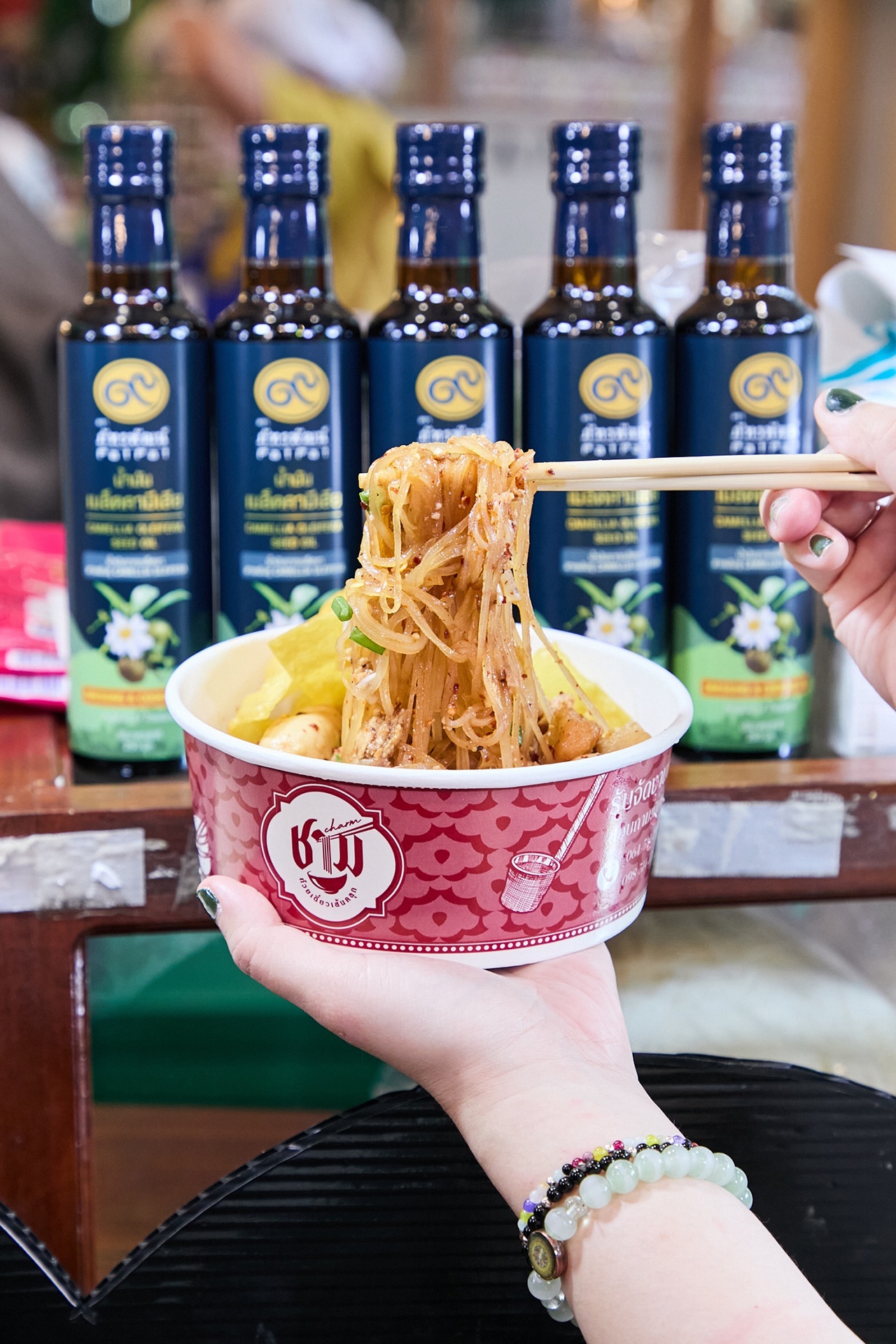 พร้อมชวนอิ่มอร่อยกับเมนูจากร้านดังปรุงด้วย น้ำมันเมล็ดคามีเลีย อาทิ ลูกชิ้นลวกหอมเจียว จากร้านกิมง้วนลูกชิ้นปลา, แกงปูใบชะพลู จากร้านครัวต้นฝน อาหารใต้พังงา, บะหมี่เป๊าะคลุกแห้งยำโบราณ จากร้านชาม, ผัดไทยกุ้งคุณชู จากร้านผัดไทยคุณชู, ข้าวแกงกะหรี่หมูก้อนทอด จากร้านอาม่าเคอรี่, บะหมี่หมูแดงย่างเตาถ่าน จากร้านตั้งใจย่าง, หมูสะเต๊ะ จากร้านจึงอังลัก เบเกอรี่ เค้กไข่ผำ จากร้านกาชา ทีเฮ้าส์ แอนด์ คาเฟ่ และฟูจิซังโชกุปัง จากร้าน ชิโระคุมายะเบเกอรี ตลอดจนสินค้าจากมูลนิธิชัยพัฒนามากมาย
