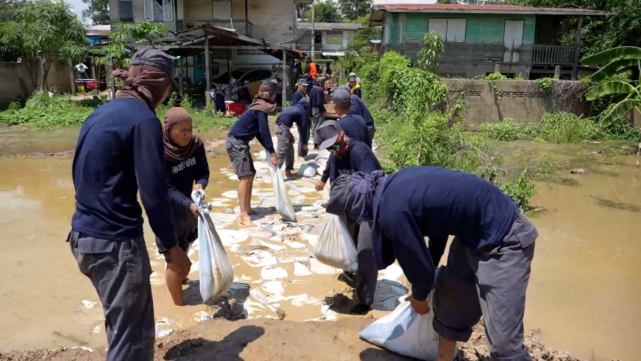 "เขื่อนเจ้าพระยา" เร่งระบายต่อเนื่อง ชาวบ้าน-ทหาร เร่งกรอกกระสอบทรายเสริมคันดินกั้นน้ำ ป้องกันน้ำที่เอ่อขึ้นมาเข้าท่วมบ้านเรือนของประชาชน