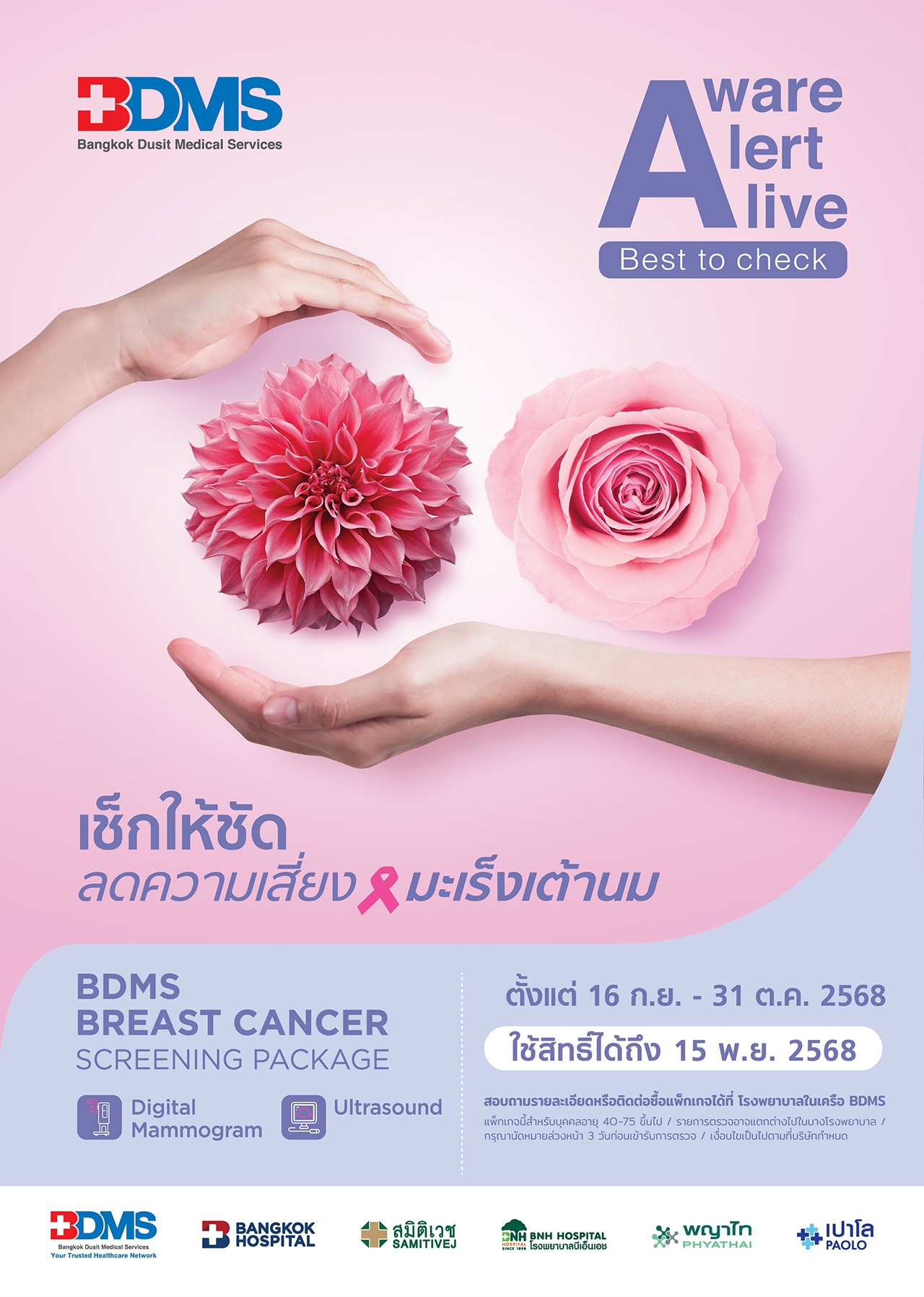 โอกาสนี้ BDMS จึงชวนทุกท่าน “CHECK to PROTECT” ด้วยแพ็กเกจตรวจคัดกรองมะเร็งเต้านม BDMS Breast Cancer Screening Package ภายใต้แนวคิด Aware Alert Alive – Best to check ในราคาพิเศษเพียง 2,900 บาท โดยสามารถซื้อแพ็กเกจได้ตั้งแต่วันที่ 16 กันยายน – 31 ตุลาคม 2568 และใช้สิทธิ์ตรวจได้ถึงวันที่ 15 พฤศจิกายน 2568 ณ โรงพยาบาลในเครือ BDMS ได้แก่ กลุ่มโรงพยาบาลกรุงเทพ กลุ่มโรงพยาบาลสมิติเวช โรงพยาบาลบีเอ็นเอช กลุ่มโรงพยาบาลพญาไท และกลุ่มโรงพยาบาลเปาโล