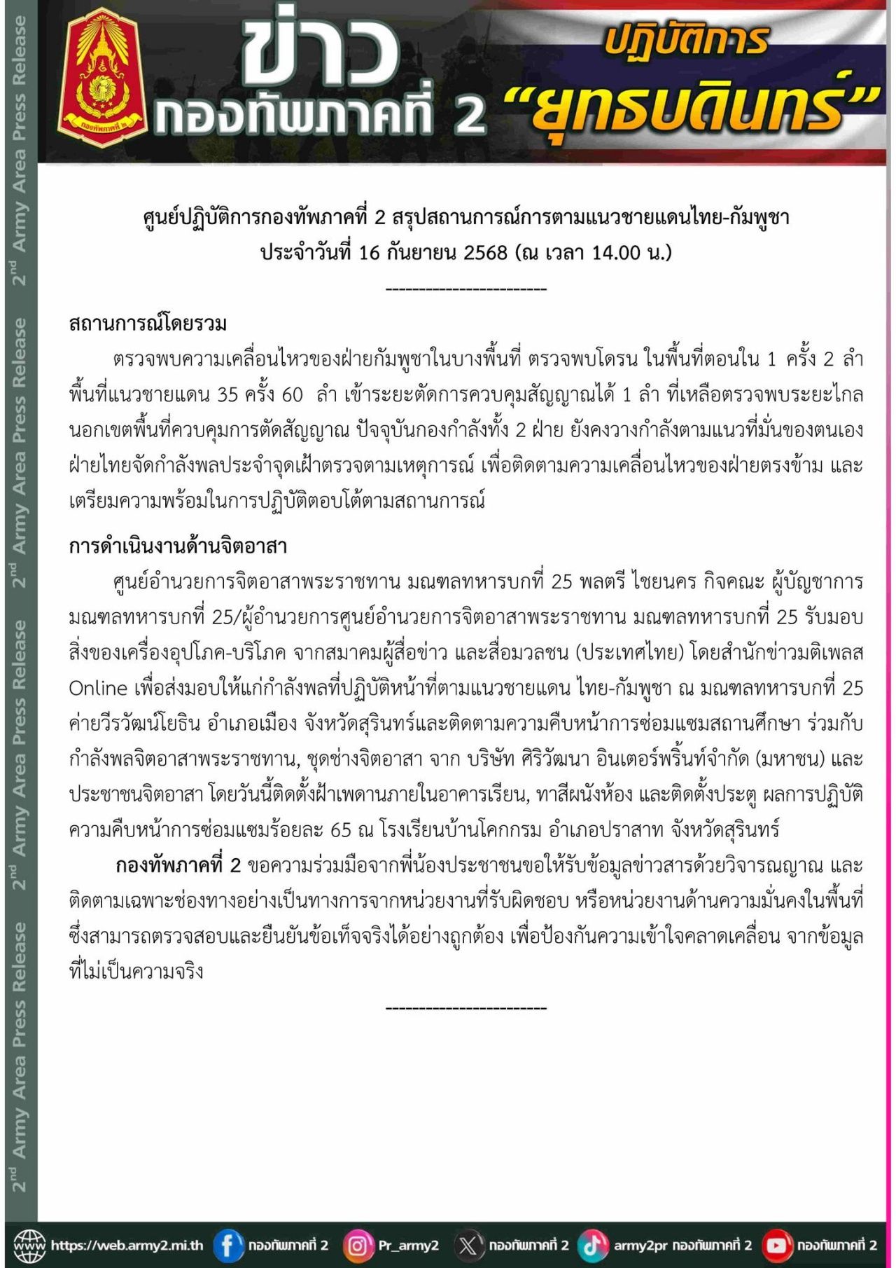 วันที่ 16 กันยายน 2568 ศูนย์ปฏิบัติการกองทัพภาคที่ 2 สรุปสถานการณ์การตามแนวชายแดนไทย-กัมพูชา ประจำวันที่ 16 กันยายน 2568 ณ เวลา 14.00 น.