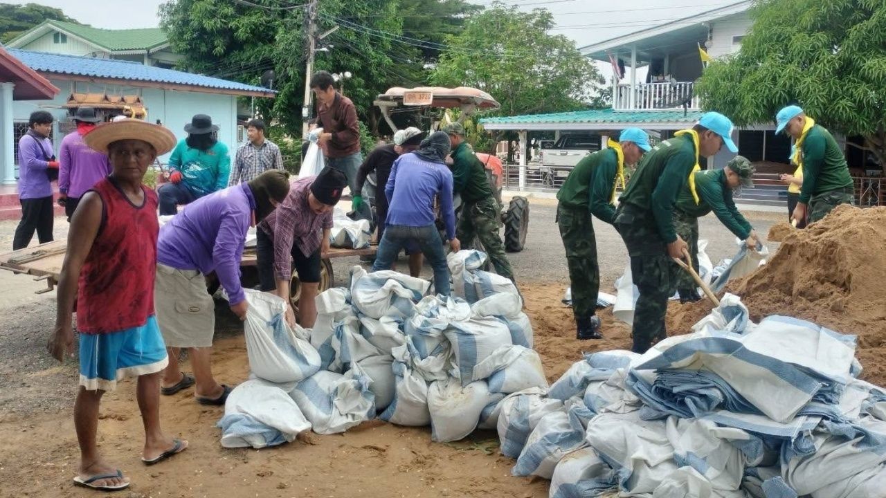ส่วนพื้นที่ท้ายเขื่อนเจ้าพระยา เร่งกรอกกระสอบทรายวางแนวป้องกันจุดเสี่ยงน้ำท่วมชุมชน น้ำเอ่อล้นเข้าท่วมบ้านเรือนประชาชนท้ายเขื่อนเจ้าพระยาแล้วกว่า 300 หลังคาเรือน
