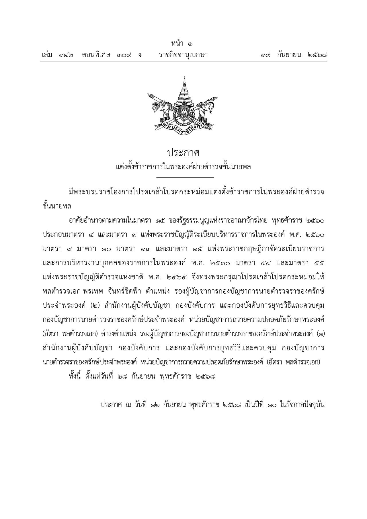 ราชกิจจานุเบกษา เผยแพร่พระบรมราชโองการ โปรดเกล้าฯ แต่งตั้ง พลตำรวจเอก พรเทพ จันทร์ชิดฟ้า ข้าราชการในพระองค์ฝ่ายตำรวจชั้นนายพล
