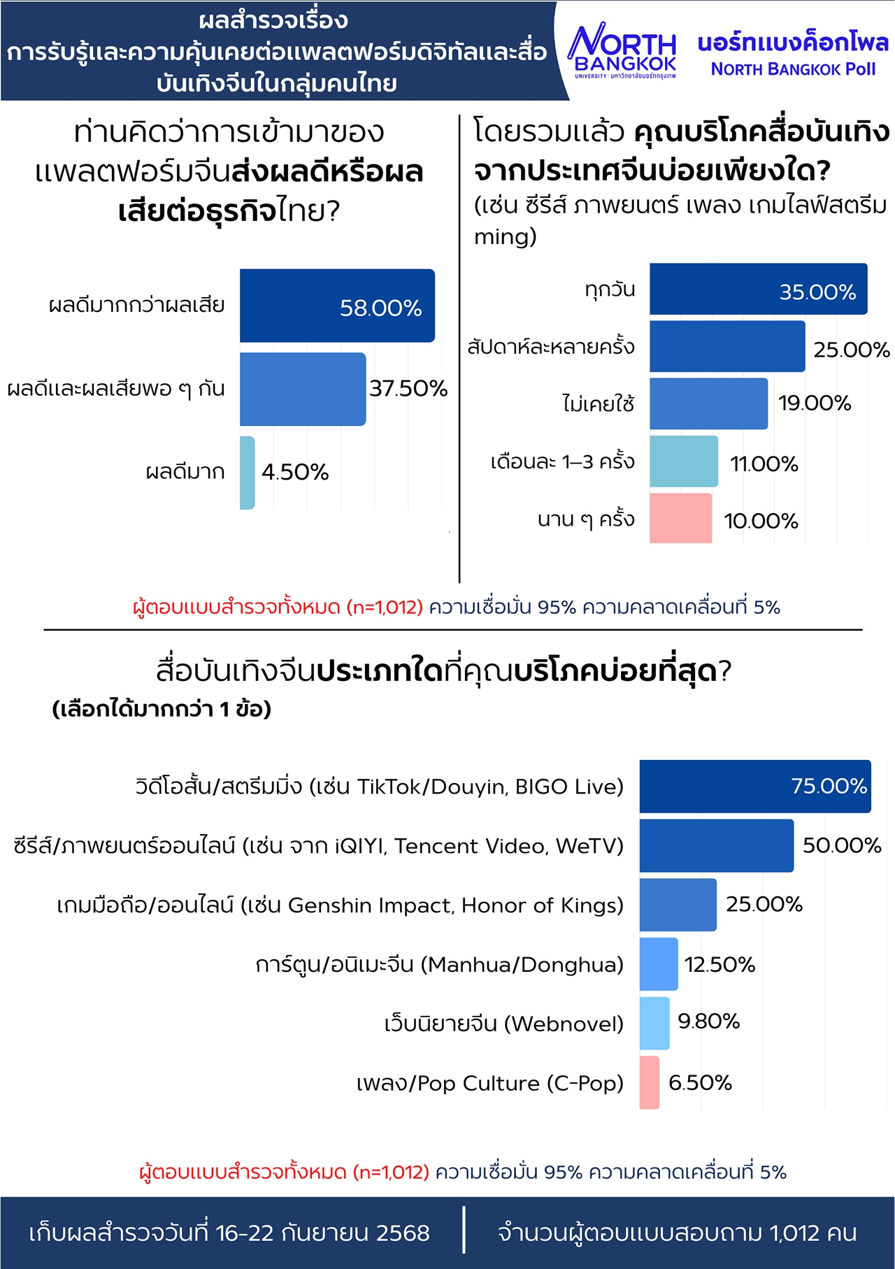 ผศ. ดร. สานิต ศิริวิศิษฐ์กุล หัวหน้าศูนย์สำรวจความคิดเห็น นอร์ทแบงค็อกโพล มหาวิทยาลัยนอร์ทกรุงเทพ เปิดเผยว่า จากการสำรวจความคิดเห็นของประชาชน ระหว่างวันที่ 16-22 กันยายน 2568 จากจำนวน 1,012 ตัวอย่าง จากกลุ่มตัวอย่างทุกภูมิภาคทั่วประเทศในประเด็น “การรับรู้และความคุ้นเคยต่อแพลตฟอร์มดิจิทัลและสื่อบันเทิงจีนในกลุ่มคนไทย” ต่อข้อคำถาม