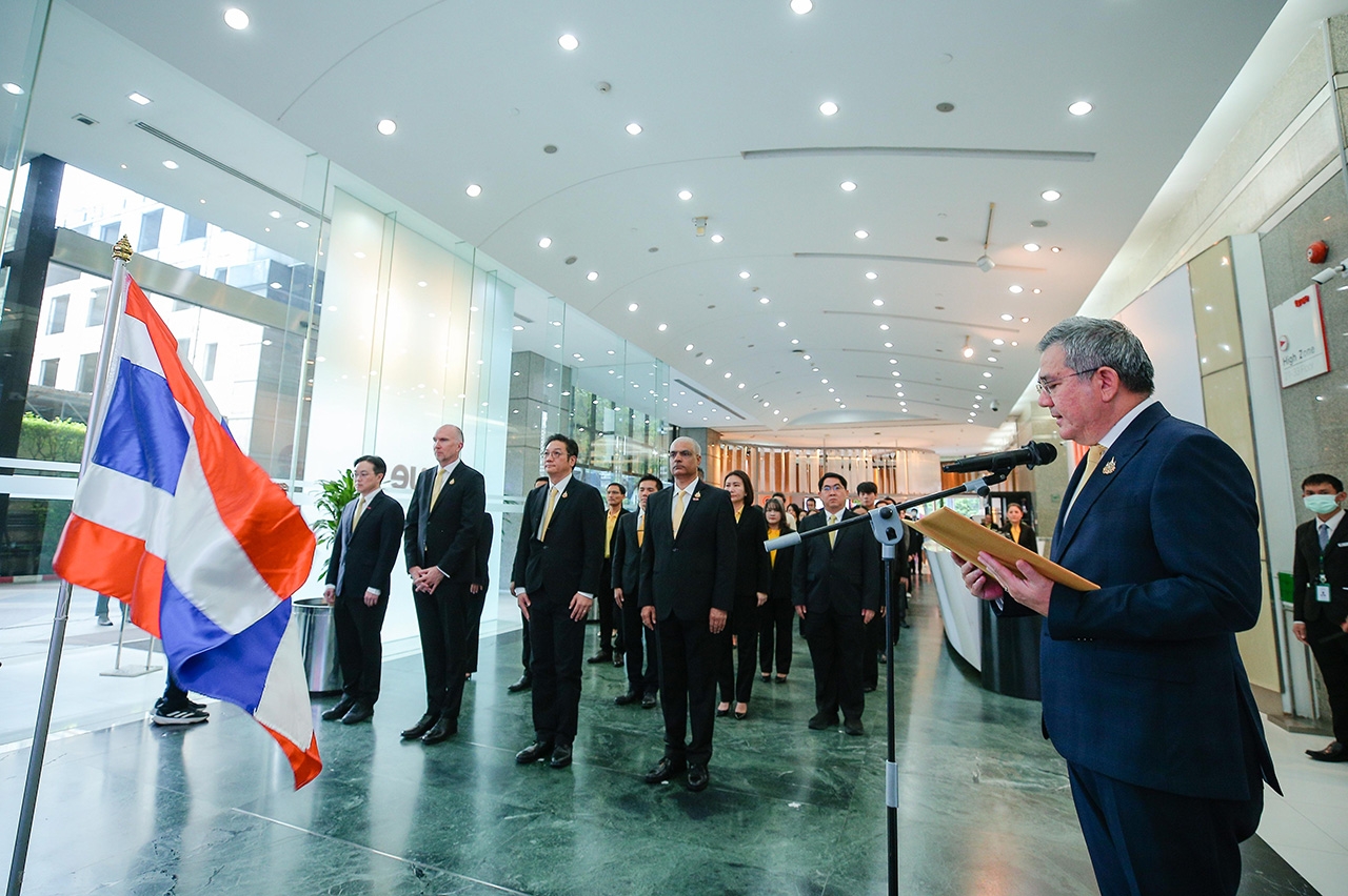 กรุงเทพฯ 26 กันยายน 2568 – บมจ. ทรู คอร์ปอเรชั่น ร่วมจัดกิจกรรมเคารพธงชาติ เนื่องในโอกาสครบรอบ 108 ปี วันพระราชทานธงชาติไทย โดยมี นายจักรกฤษณ์ อุไรรัตน์ หัวหน้าคณะผู้บริหารด้านรัฐกิจสัมพันธ์ บมจ. ทรู คอร์ปอเรชั่น พร้อมด้วย นายมนัสส์ มานะวุฒิเวช หัวหน้าคณะผู้บริหารด้านประสบการณ์ลูกค้าและธุรกิจรีเทล นายชารัด เมห์โรทรา หัวหน้าคณะผู้บริหารด้านกลุ่มธุรกิจลูกค้าบุคคล นายฮากุน บริวเช็ท เชิร์ล หัวหน้าคณะผู้บริหารด้านกลยุทธ์และทรานสฟอร์มเมชั่น นายนิติธรรม โกวิทกูลไกร หัวหน้าสายงานด้านผลิตภัณฑ์และบริการ พร้อมด้วยคณะผู้บริหารและเพื่อนพนักงาน ร่วมกันยืนตรงเคารพธงชาติและร้องเพลงชาติไทยอย่างพร้อมเพรียงกัน ในเวลา 8.00 น. ณ อาคารทรู ทาวเวอร์ ถนนรัชดาภิเษก