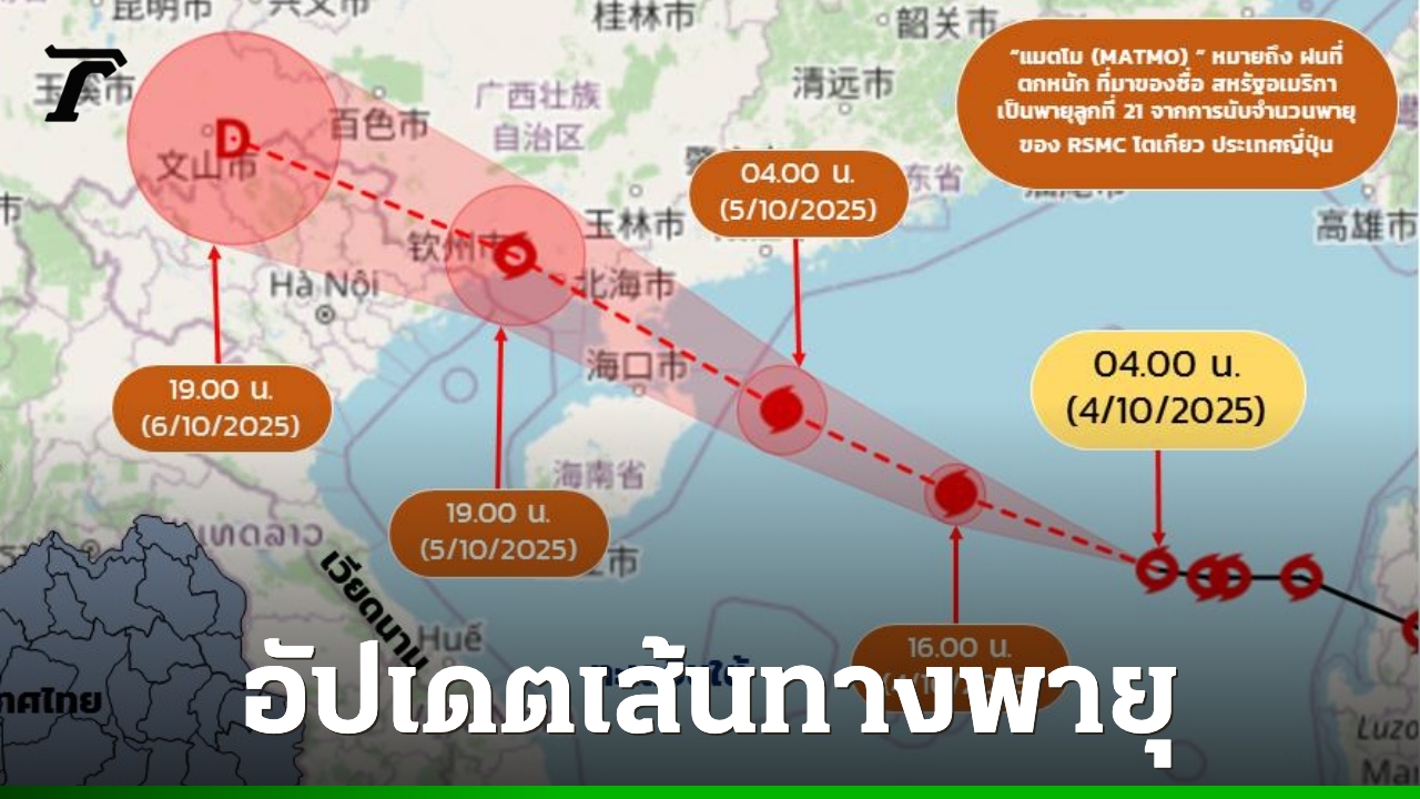 วันที่ 4 ต.ค. 2568 เฟซบุ๊ก กรมอุตุนิยมวิทยา โพสต์ข้อความโดยระบุว่า อัปเดตเส้นทางพายุโซนร้อนกำลังแรง "แมตโม (MATMO)" ได้เคลื่อนลงสู่ทะเลจีนใต้ตอนบนแล้ว กำลังเคลื่อนตัวไปทางเกาะไหลหลำ และคาดว่าจะขึ้นฝั่งที่ประเทศจีนตอนใต้หรือแนวประเทศเวียดนามตอนบน ช่วงวันที่ 5-6 ต.ค. 2568 มีแนวโน้มจะแรงขึ้นเป็นพายุไต้ฝุ่นได้
