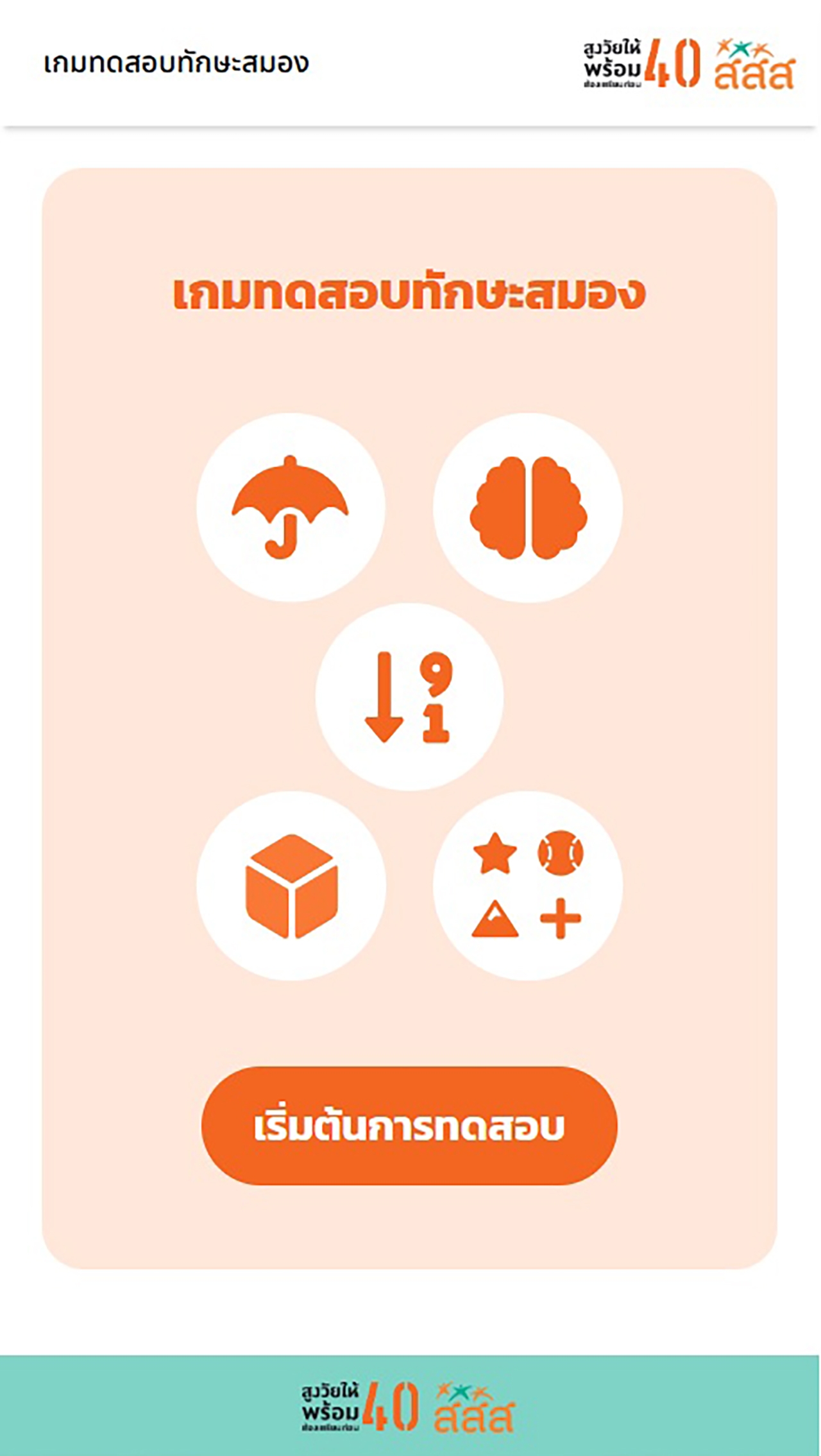 หนึ่งในเครื่องมือที่ถูกออกแบบขึ้นเพื่อช่วยให้ประชาชนเข้าใจสุขภาพสมองของตัวเองก็คือ “เกมทดสอบทักษะสมอง” ที่พัฒนาโดยสำนักงานกองทุนสนับสนุนการสร้างเสริมสุขภาพ (สสส.) ร่วมกับภาคีเครือข่ายด้านสุขภาพสมอง ซึ่งมีเป้าหมายร่วมกันในการส่งเสริมให้คนไทย “สูงวัยอย่างมีคุณภาพ” ผ่านแคมเปญ “สูงวัยให้พร้อม ต้องเตรียมก่อน 40” จึงได้ออกแบบเครื่องมือ ให้คนทั่วไปได้ประเมินสุขภาพสมองของตนเองอย่างง่าย ๆ ใช้เวลาเพียงไม่กี่นาที แต่สามารถสะท้อนถึงทักษะสำคัญที่เรามักไม่รู้ตัวว่ากำลังเสื่อมถอยลง