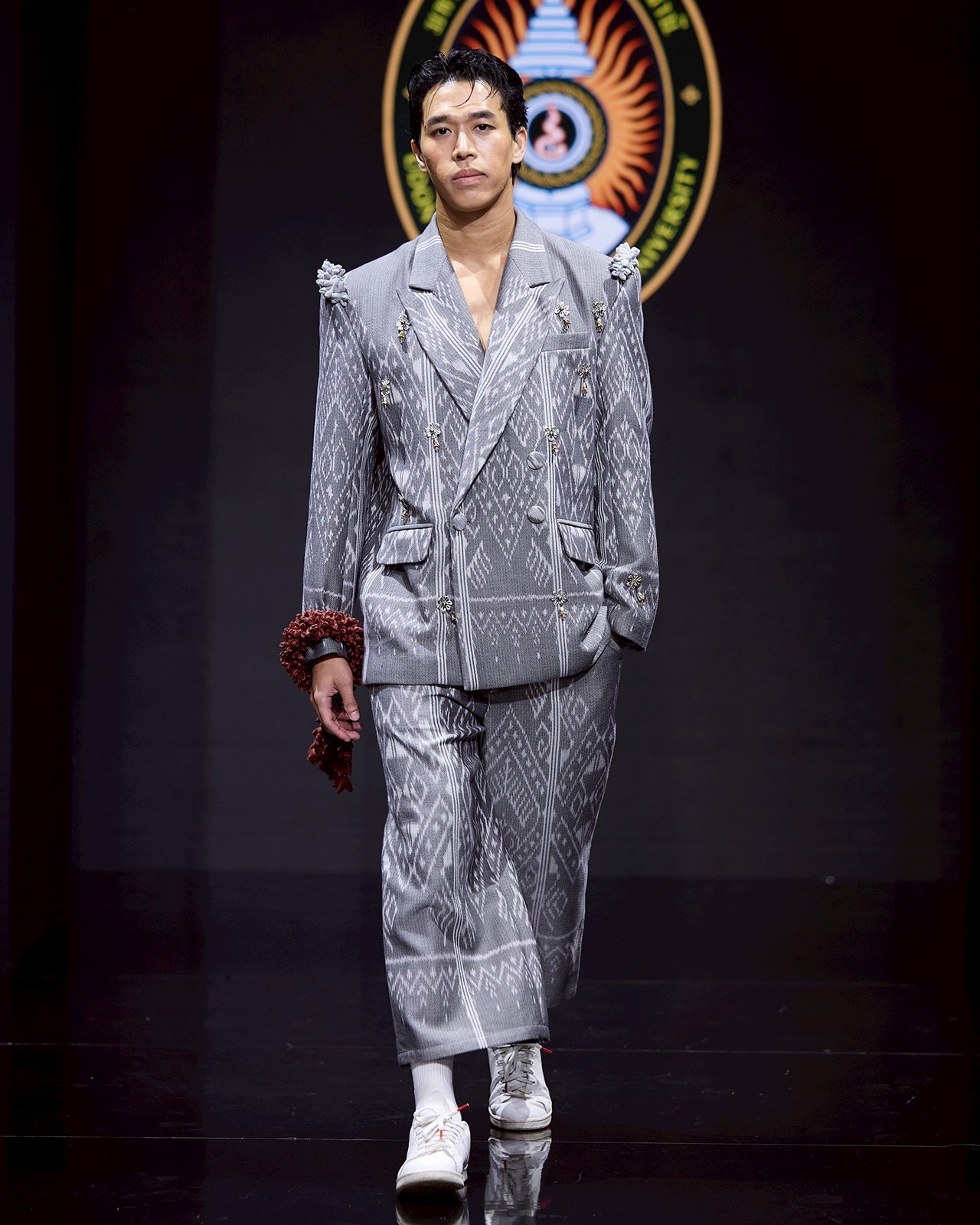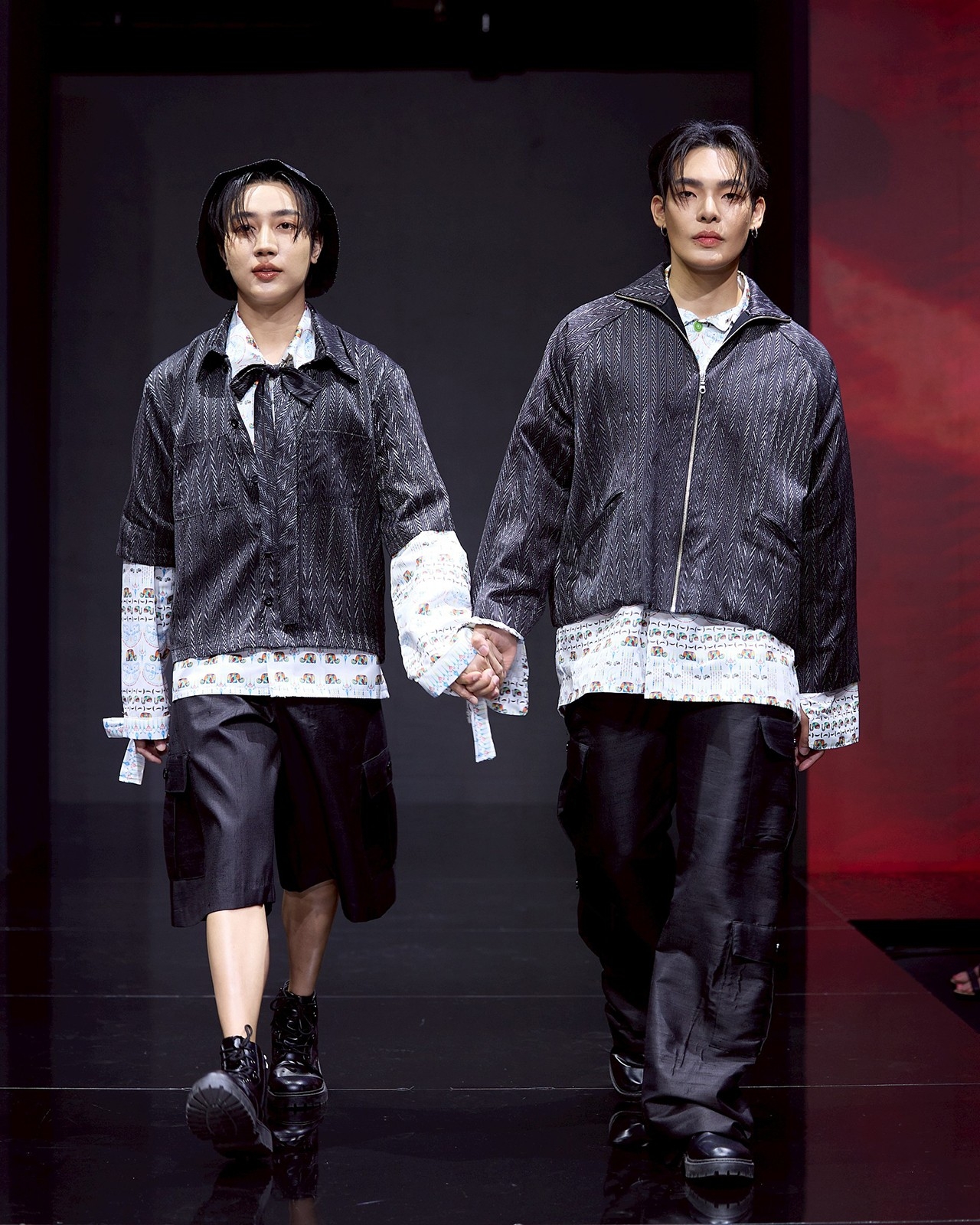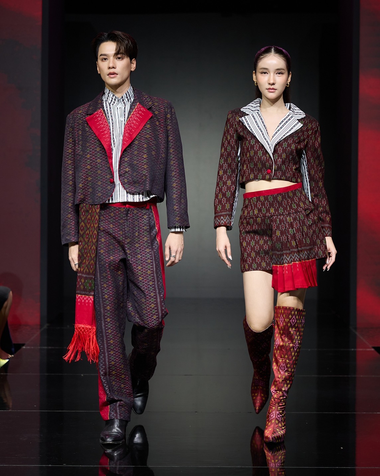 ในวันเปิดงาน สัมผัสถึงภูมิปัญญาท้องถิ่นที่นำเสนอโดยคนรุ่นใหม่ ด้วยโชว์จาก มหาวิทยาลัยเทคโนโลยีราชมงคลพระนคร ที่มาพร้อมกับ “ผ้าซิ่นตีนแดง” ซึ่งเป็นผ้าไหมทอมือเอกลักษณ์ท้องถิ่นของจังหวัดบุรีรัมย์ โดยลักษณะผ้าไหมจะเป็นมัดหมี่ลายพื้นเมือง ทอด้วยไหมทั้งผืน หัวซิ่นและตีนซิ่นของผ้าเป็นสีแดงสด มักนิยมสวมใส่ในงานบุญและในงานแต่งงาน โดยยังก์ดีไซเนอร์ ได้ร่วมมือกับศิลปินรุ่นใหม่ ‘เก่ง- หฤษฎ์ บัวย้อย’ จากซีรีส์ที่มีความเป็นไทยสร้างสรรค์อย่างเต็มเปี่ยมอย่าง เขมจิราต้องรอด มาร่วมบอกเล่าความรู้สึกและมุมมองที่มีต่อศิลปวัฒนธรรม ก่อเกิดผลงานที่เต็มไปด้วยเรื่องราวที่เต็มไปด้วยกลิ่นอายของจิตวิญญาณรากฐานท้องถิ่น ผ่านลวดลาย ‘ฟันเลื่อย’ และ ‘ขอ’ ที่นำมาตีความใหม่แบบร่วมสมัย การเลือกใช้โทนสีแดงอันเป็นเอกลักษณ์ของลวดลายผ้ามาตกแต่งบริเวณชายเสื้อเพื่อเพิ่มมิติและความน่าสนใจ