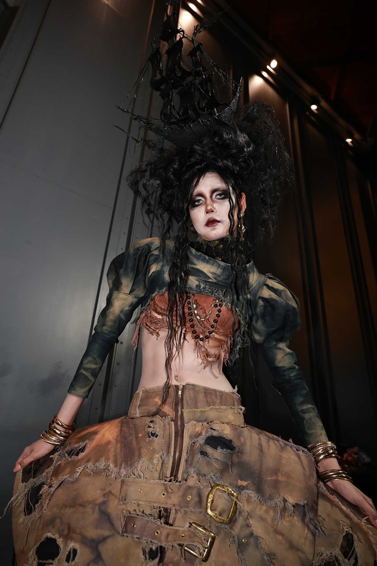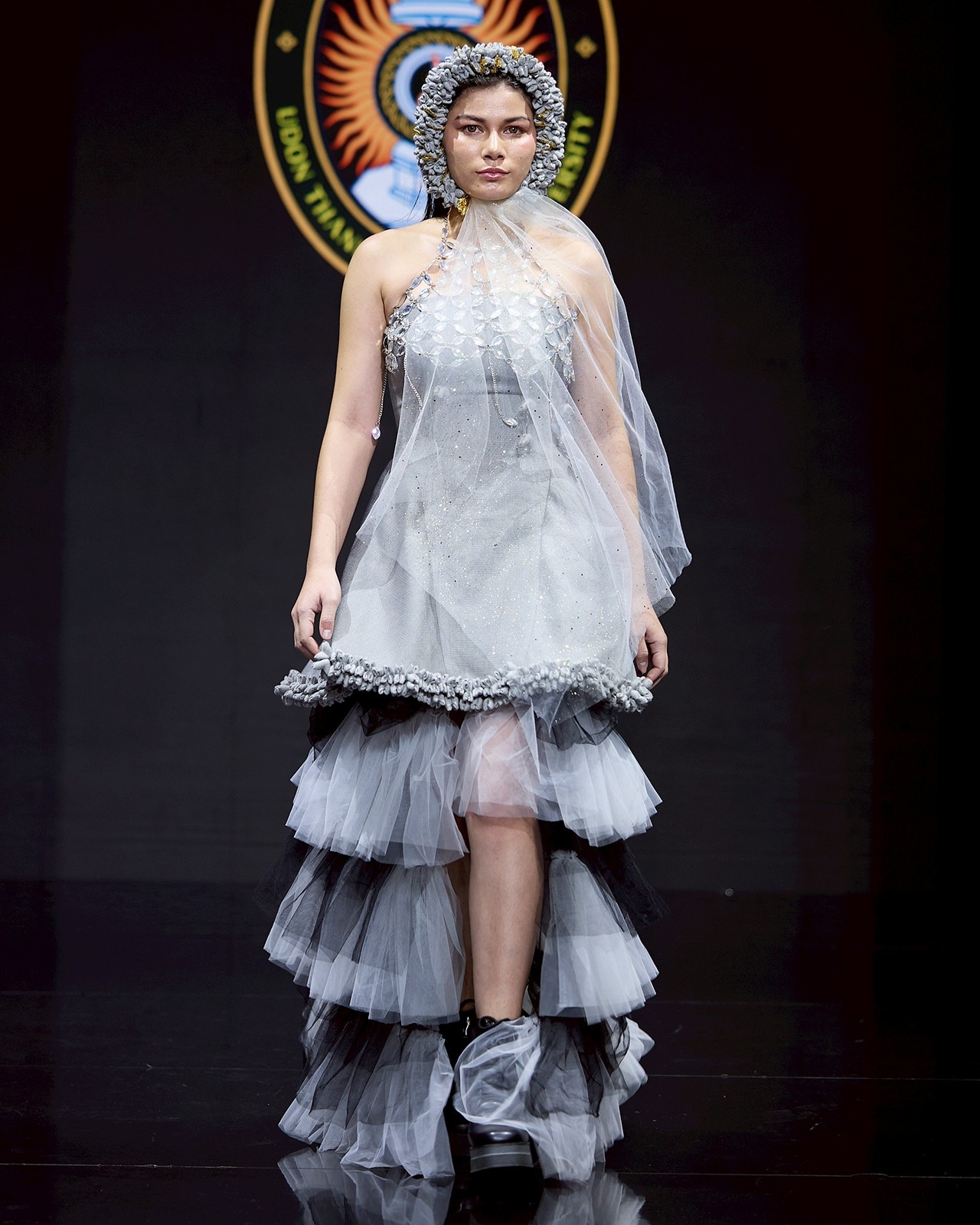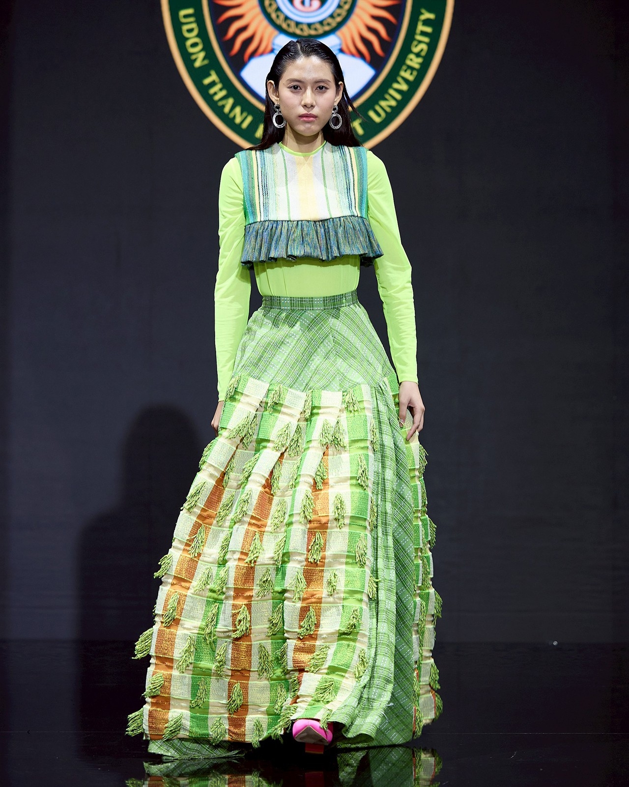 ในวันเปิดงาน สัมผัสถึงภูมิปัญญาท้องถิ่นที่นำเสนอโดยคนรุ่นใหม่ ด้วยโชว์จาก มหาวิทยาลัยเทคโนโลยีราชมงคลพระนคร ที่มาพร้อมกับ “ผ้าซิ่นตีนแดง” ซึ่งเป็นผ้าไหมทอมือเอกลักษณ์ท้องถิ่นของจังหวัดบุรีรัมย์ โดยลักษณะผ้าไหมจะเป็นมัดหมี่ลายพื้นเมือง ทอด้วยไหมทั้งผืน หัวซิ่นและตีนซิ่นของผ้าเป็นสีแดงสด มักนิยมสวมใส่ในงานบุญและในงานแต่งงาน โดยยังก์ดีไซเนอร์ ได้ร่วมมือกับศิลปินรุ่นใหม่ ‘เก่ง- หฤษฎ์ บัวย้อย’ จากซีรีส์ที่มีความเป็นไทยสร้างสรรค์อย่างเต็มเปี่ยมอย่าง เขมจิราต้องรอด มาร่วมบอกเล่าความรู้สึกและมุมมองที่มีต่อศิลปวัฒนธรรม ก่อเกิดผลงานที่เต็มไปด้วยเรื่องราวที่เต็มไปด้วยกลิ่นอายของจิตวิญญาณรากฐานท้องถิ่น ผ่านลวดลาย ‘ฟันเลื่อย’ และ ‘ขอ’ ที่นำมาตีความใหม่แบบร่วมสมัย การเลือกใช้โทนสีแดงอันเป็นเอกลักษณ์ของลวดลายผ้ามาตกแต่งบริเวณชายเสื้อเพื่อเพิ่มมิติและความน่าสนใจ