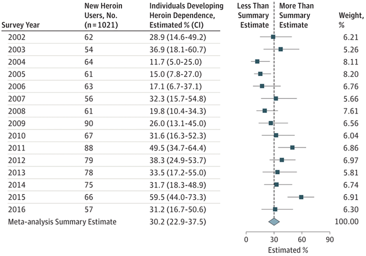 ตารางนี้แสดงค่าประมาณสัดส่วน “ผู้ติดสารเสพติด" หลังใช้เฮโรอีน "ครั้งแรก" อยู่ที่ประมาณ 1 ใน 3 อัตราส่วนนี้คือค่าประมาณสัดส่วนผู้เสพติด หลังใช้สารเสพติดเฮโรอีน "ครั้งแรก" อยู่ที่ 23%-38% (summary estimate เฉลี่ยอยู่ที่ 30%) แหล่งข้อมูลอ้างอิง https://jamanetwork.com/journals/jamapsychiatry/fullarticle/2681168