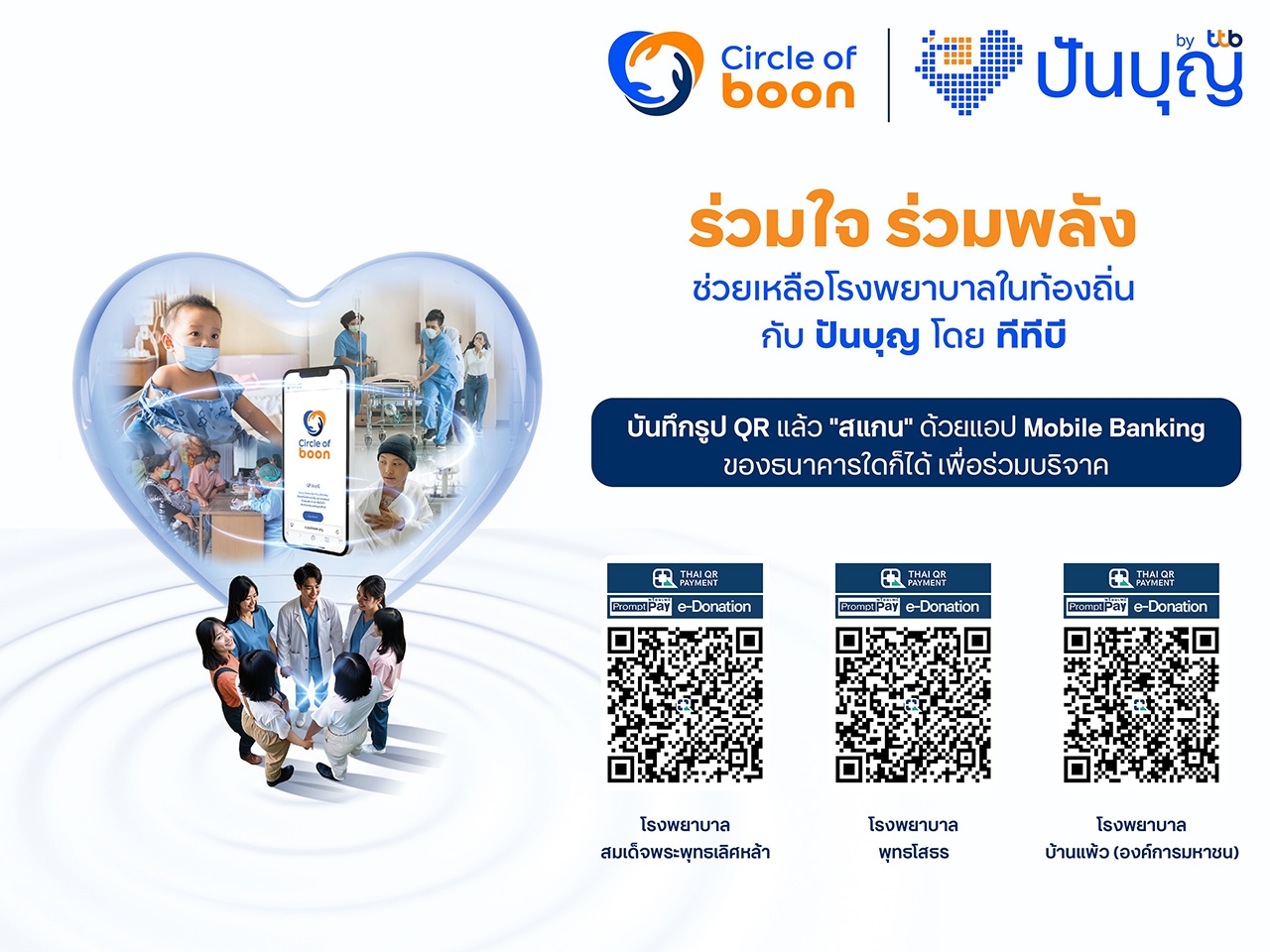 เพราะพลังแห่งการให้ เป็นวัฏจักรที่ไม่มีวันสิ้นสุด ทีทีบียกระดับบทบาทของธนาคารในฐานะผู้ขับเคลื่อนความยั่งยืนของสังคม กับการระดมเงินบริจาคเพื่อโรงพยาบาลท้องถิ่น ผ่านโครงการ “Circle of boon วัฏจักรพลังการแบ่งปัน” ที่ดำเนินการภายใต้ “ปันบุญ โดย ทีทีบี” ซึ่งผู้มีจิตศรัทธาสามารถร่วมบริจาคได้ทุกที่ทุกเวลา ผ่านเว็บไซต์ Punboon.org ที่ปลอดภัย เชื่อถือได้ และมีความโปร่งใสทุกขั้นตอน ให้ผู้บริจาคมั่นใจได้ว่า เงินทุกบาทส่งตรงถึงโรงพยาบาลอย่างแท้จริง และโรงพยาบาลท้องถิ่นได้ลงทะเบียน e-Donation กับกรมสรรพากร จึงเป็นทางเลือกให้ผู้บริจาคในการลดหย่อนภาษี 2 เท่าของเงินบริจาคอีกด้วย ขอเชิญชวนทุกคนมาร่วมเป็นส่วนหนึ่งของ “Circle of boon” วัฏจักรพลังแห่งการแบ่งปัน ทุกบาทของคุณสามารถเปลี่ยนชีวิตผู้ป่วยได้จริง และยั่งยืน
